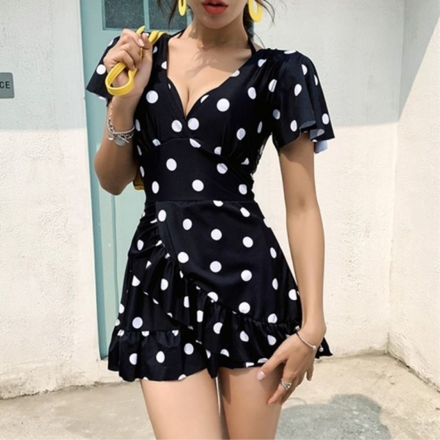 水着 ワンピース 体型カバー ワンピース水着 オールインワン 水着 ワンピース 40代 大きいサイズ 4XL 水着 レディース 可愛い 夏 新作 ドット柄 Vネック 半袖 フリル スカート 水着