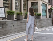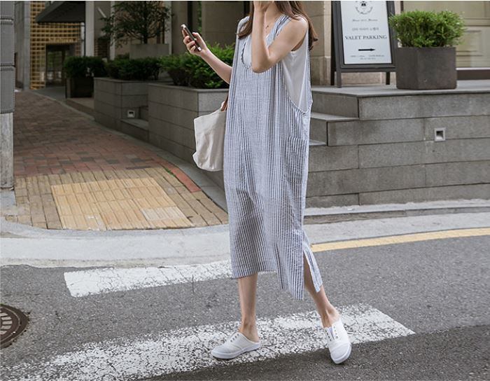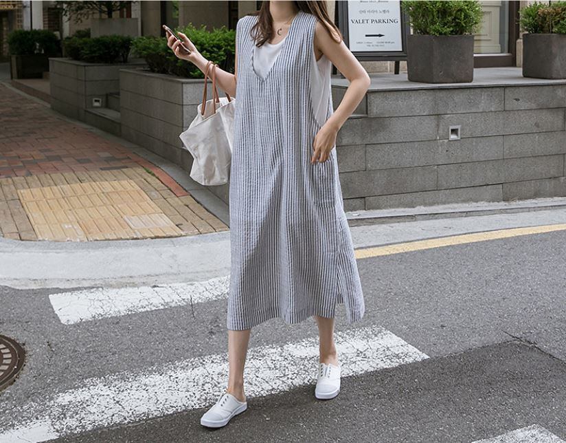 コットンとリネン ストライプのVネック ノースリーブ サイドスリット ワンピース 505