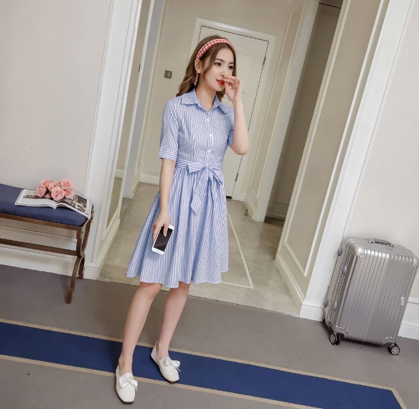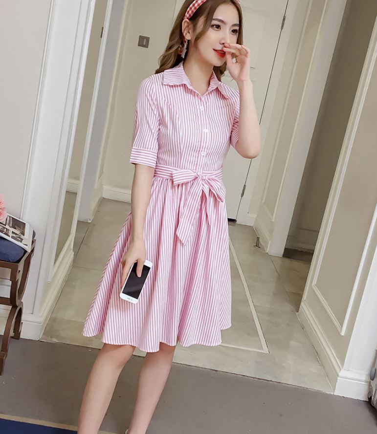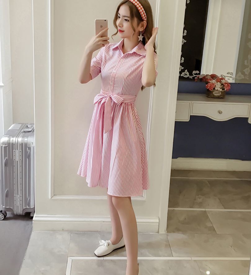 2018夏の新作 半袖ストライプのひざ上丈スカートのシャツ衿ワンピース 515
