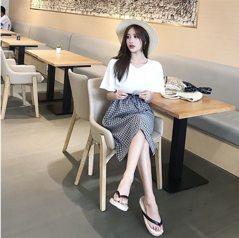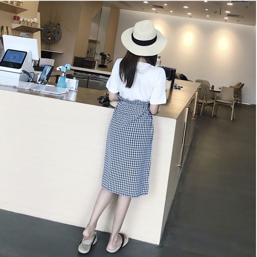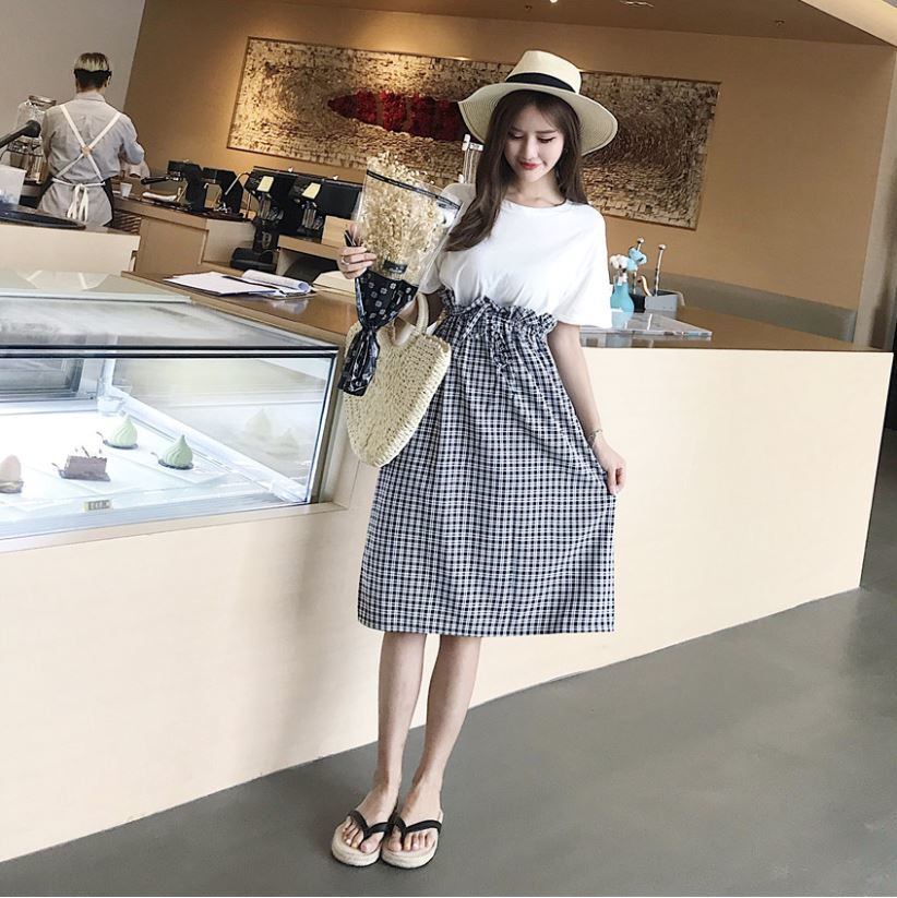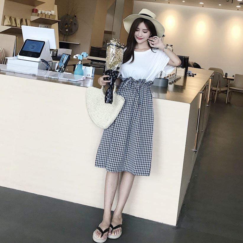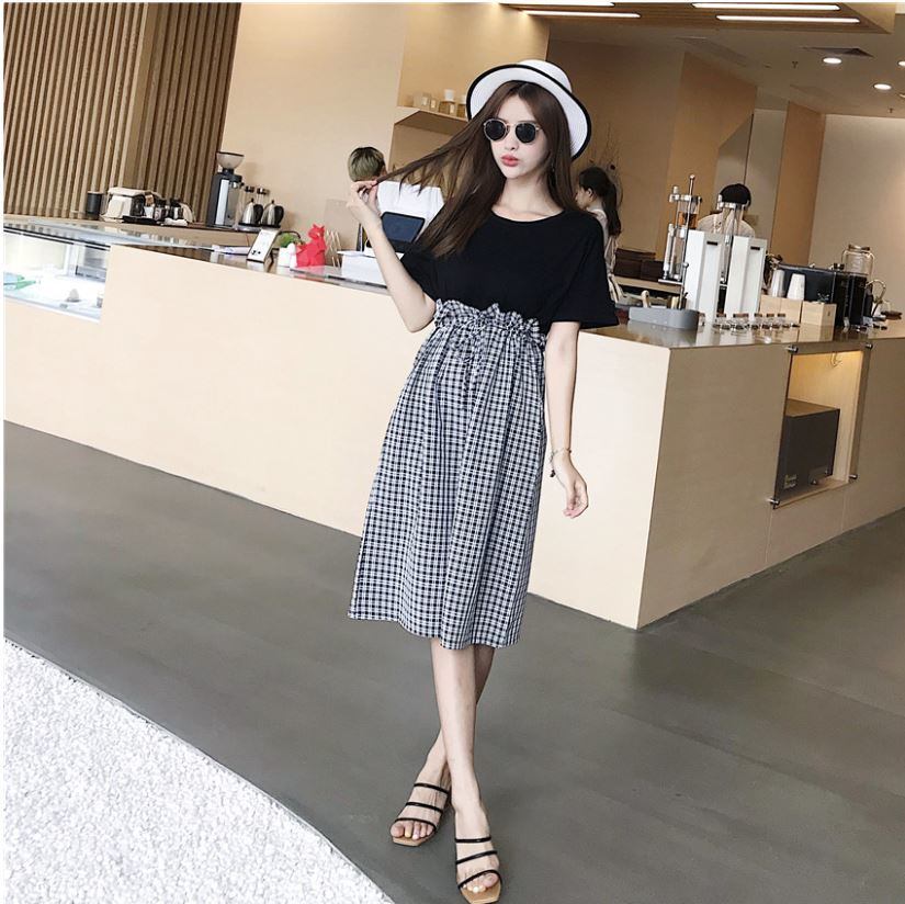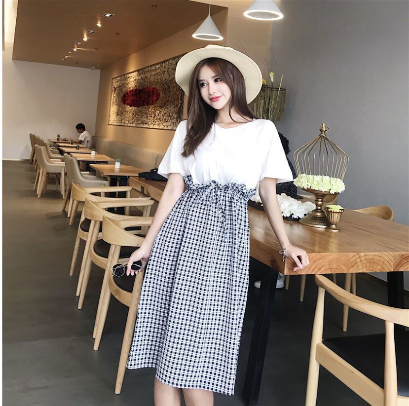 半袖Tシャツとチェック柄のハイウエストスカートワンピース 520