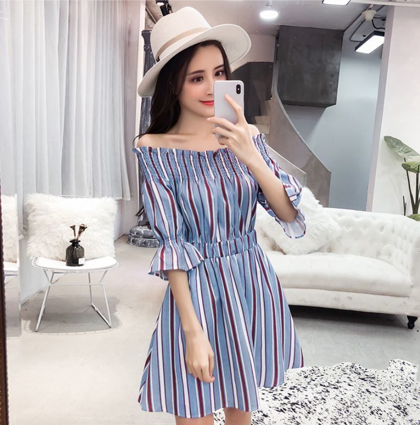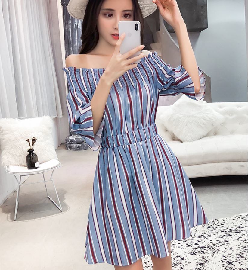 縦ボーダー柄の半袖 スリムなウエストのオフショウルダーワンピース 521