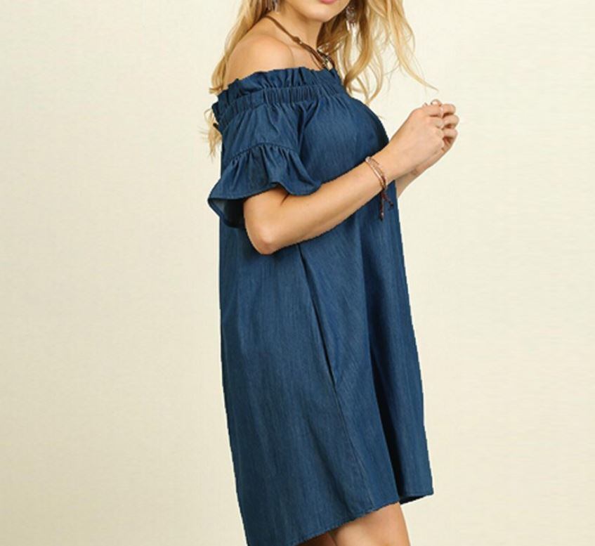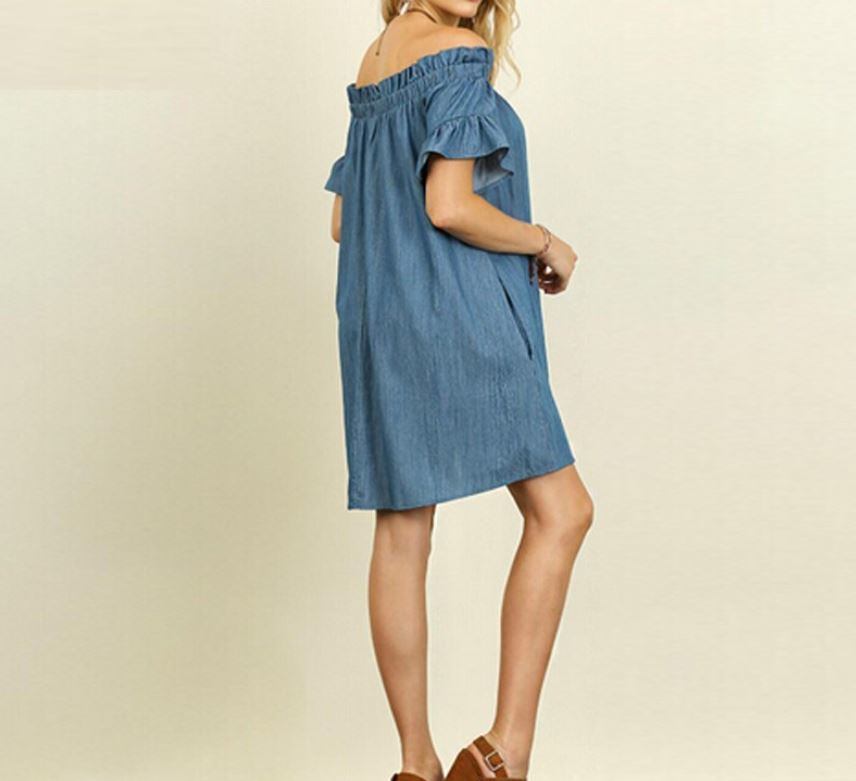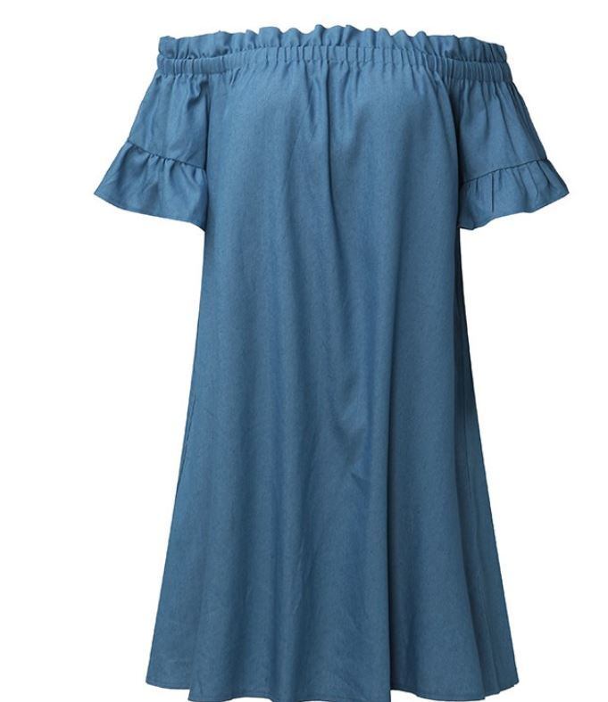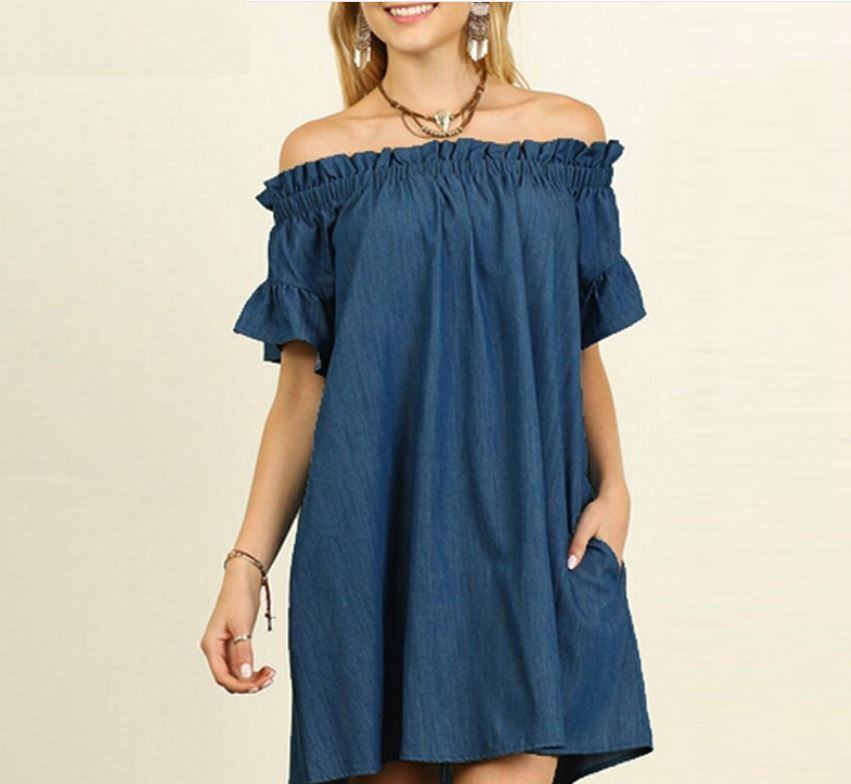 欧米風のデニムタッチ ソリッドカラー シャーリング オフショウルダー ワンピース 528