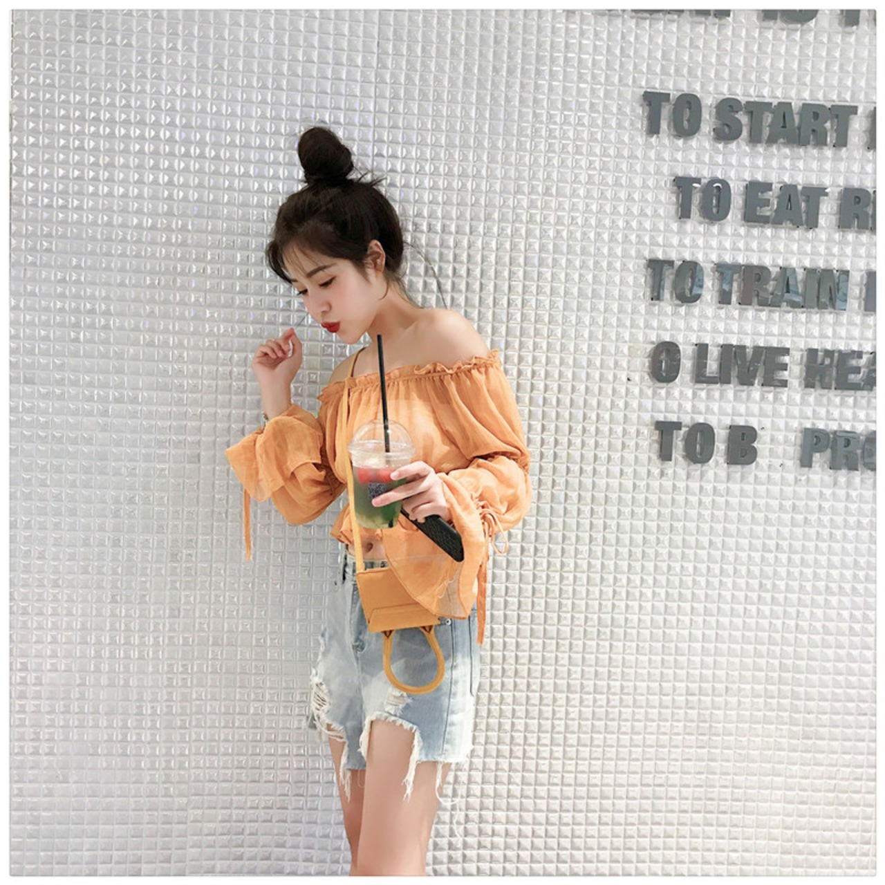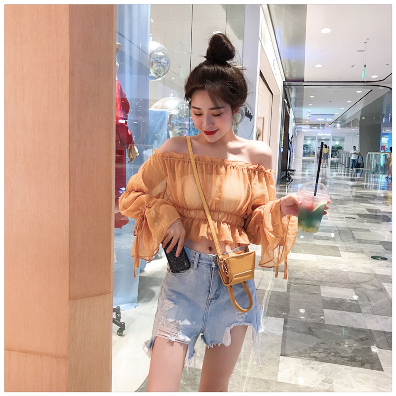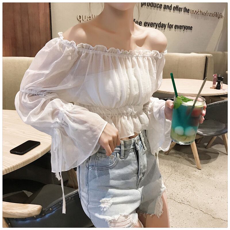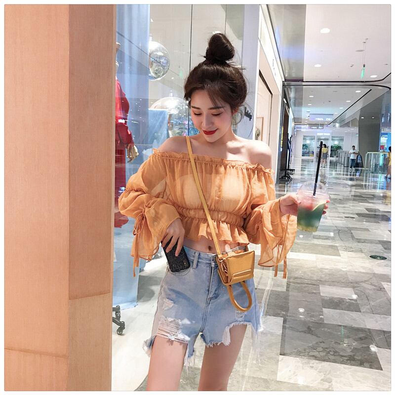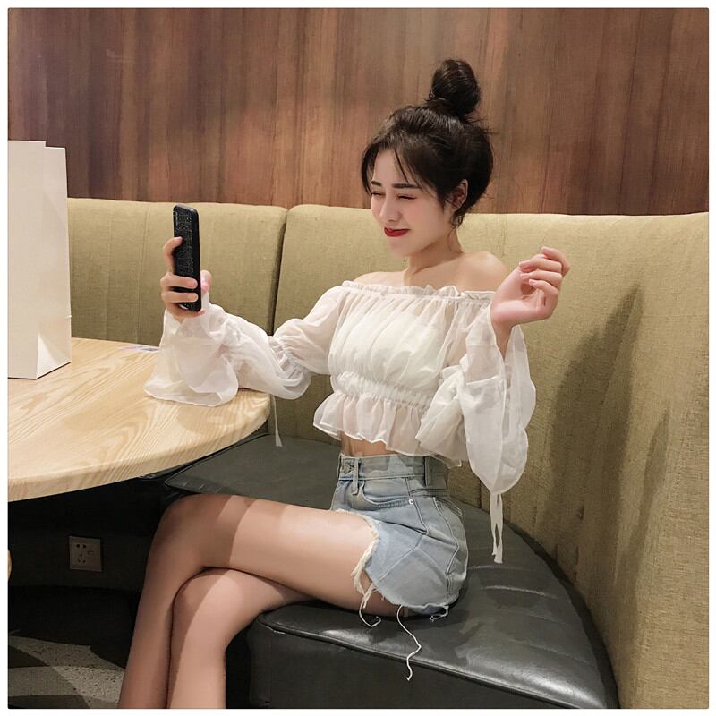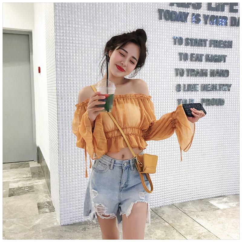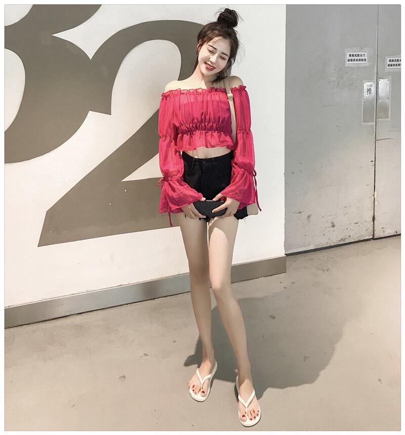 2018年夏新作 オフショルダーシフォンショートトップス へそ出し 肌見せ 330