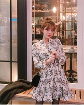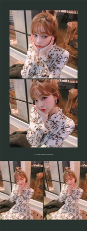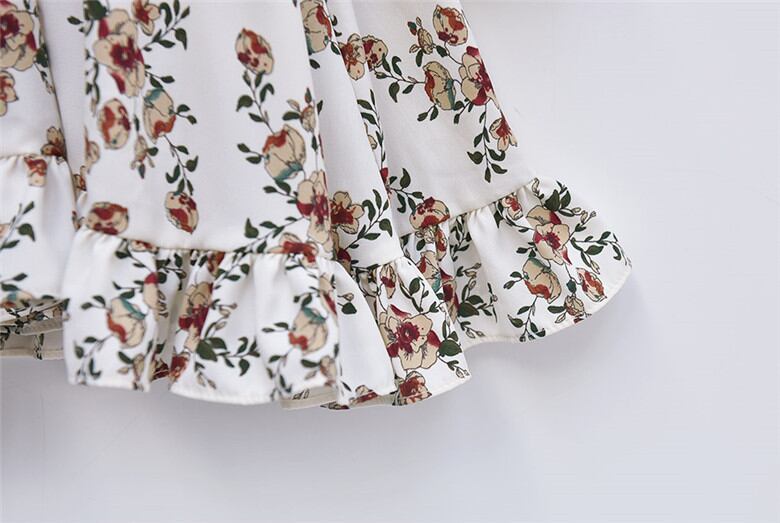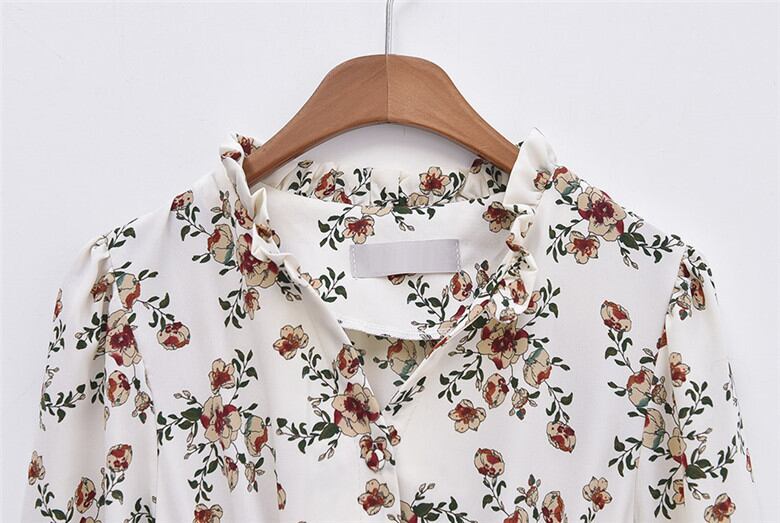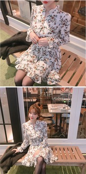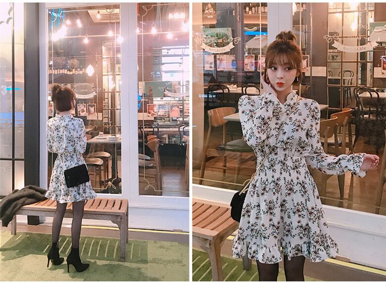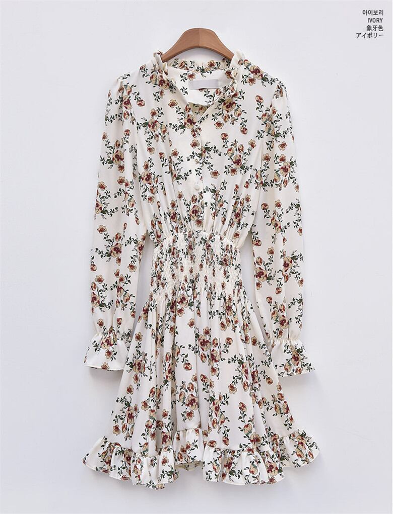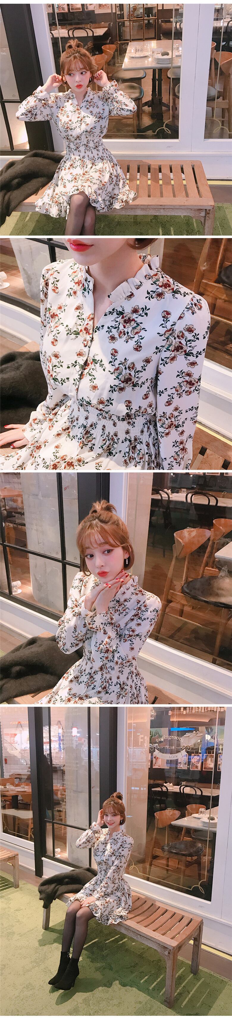 大人かわいいフラワープリントフリルハイネックワンピース 382