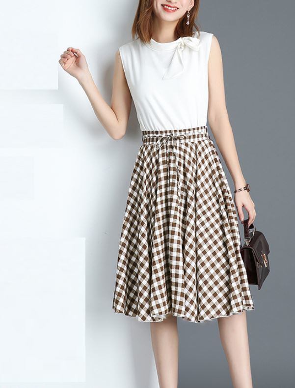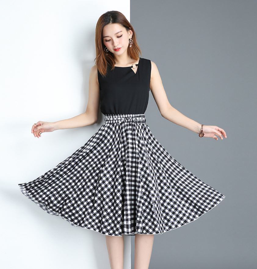 ギンガムチェック ミモレ丈 リボン ウエストゴム Aライン フレアスカート レディースファッション 大人かわいい シンプル レトロ カジュアル 夏秋 大人上品 530