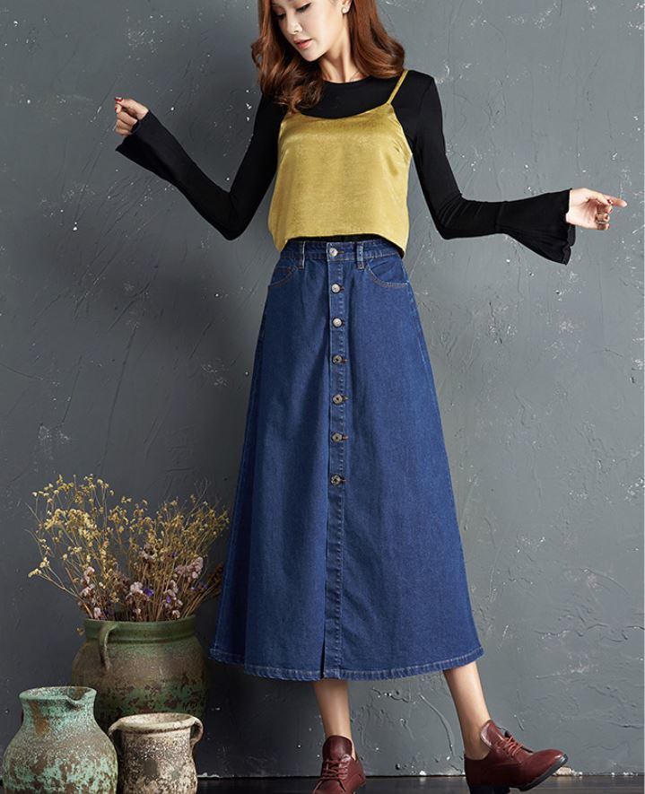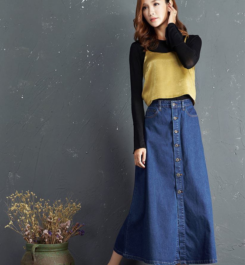 デニム マルチボタンスカート ハイウエストスリムフレアスカート ロング レディースファッション 大人かわいい シンプル レトロ カジュアル 夏秋 大人上品 545