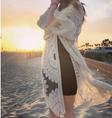 ロングカーディガン☆大きなフラワーレースがエレガント‼︎/無地 レトロ リボン 紐 レディースファッション 2018年夏 リゾート お出かけ セレブ 長袖 五分袖 849