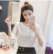 かわいい☆透け感スリーブブラウス/無地 長袖 七分袖 フリル Vネック レディースファッション 2018年夏秋 ガーリー 大人かわいい 上品 デート お出かけ 851