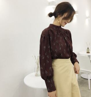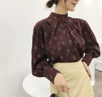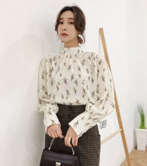 ハイネック☆ギャザリングふわっと長袖シャツ/柄 レトロ ブラウストップス レディースファッション 2018年夏秋 トレンド お出かけ デート 女子会 860