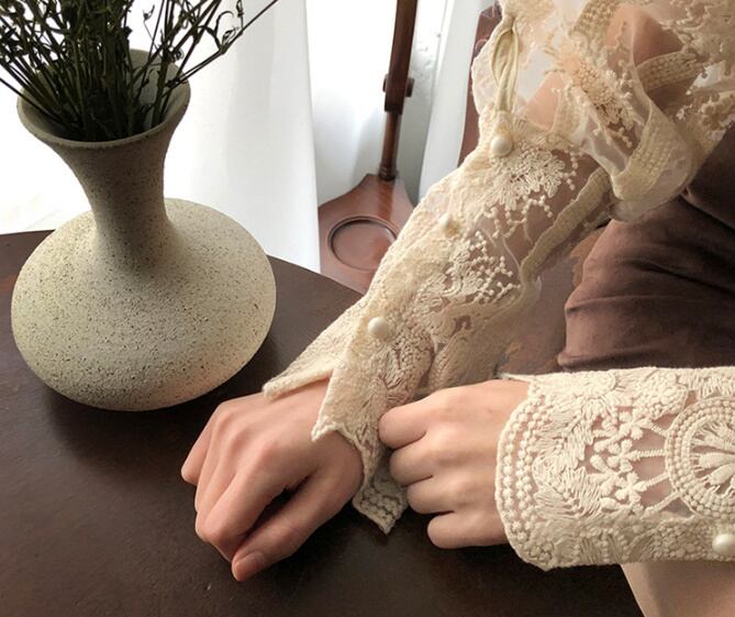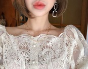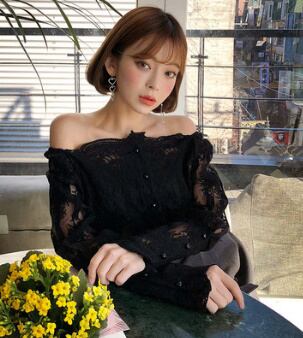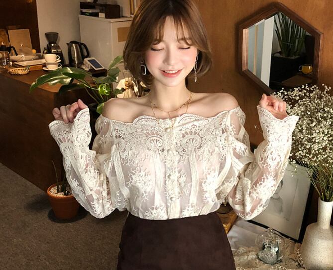 セクシーかわいい系☆オフショル メッシュレース 長袖シャツ/フロントボタン レース 透け感 ガーリー ブラウス 大人かわいい レトロ レディースファッション 2018年夏 トレンド デート 女子会 868
