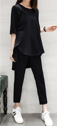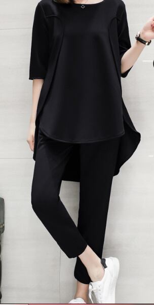 ラウンドネック☆前後差スリムシャツ&クロップドパンツセット/無地 半袖 シンプル カジュアル レトロ レディースファッション ブラック ゆったり お出かけ 着まわし 880