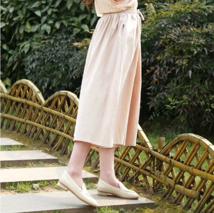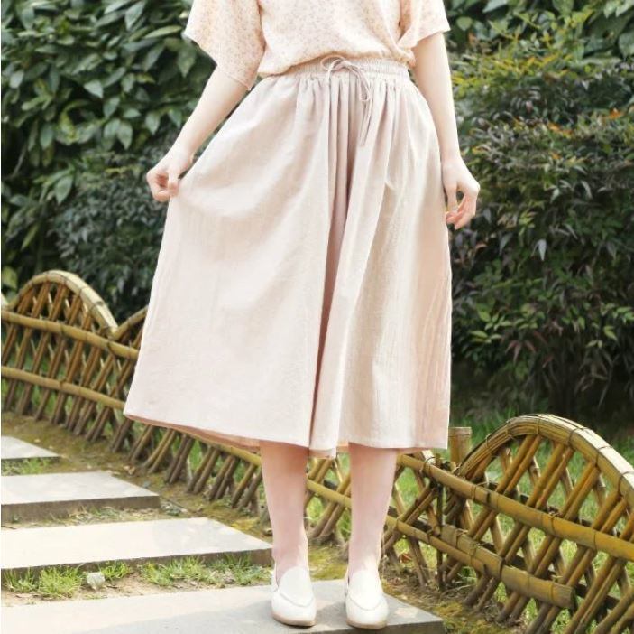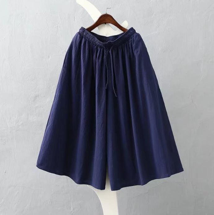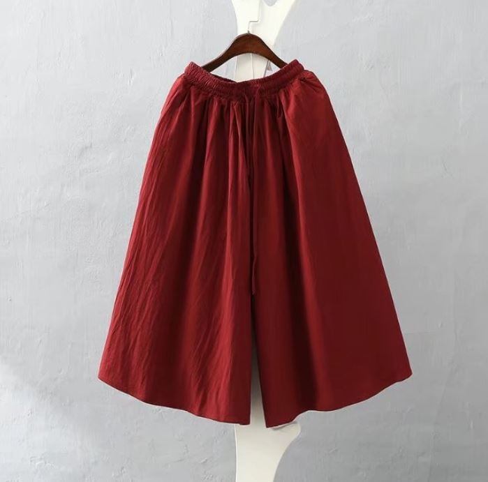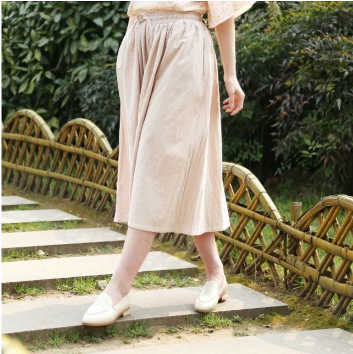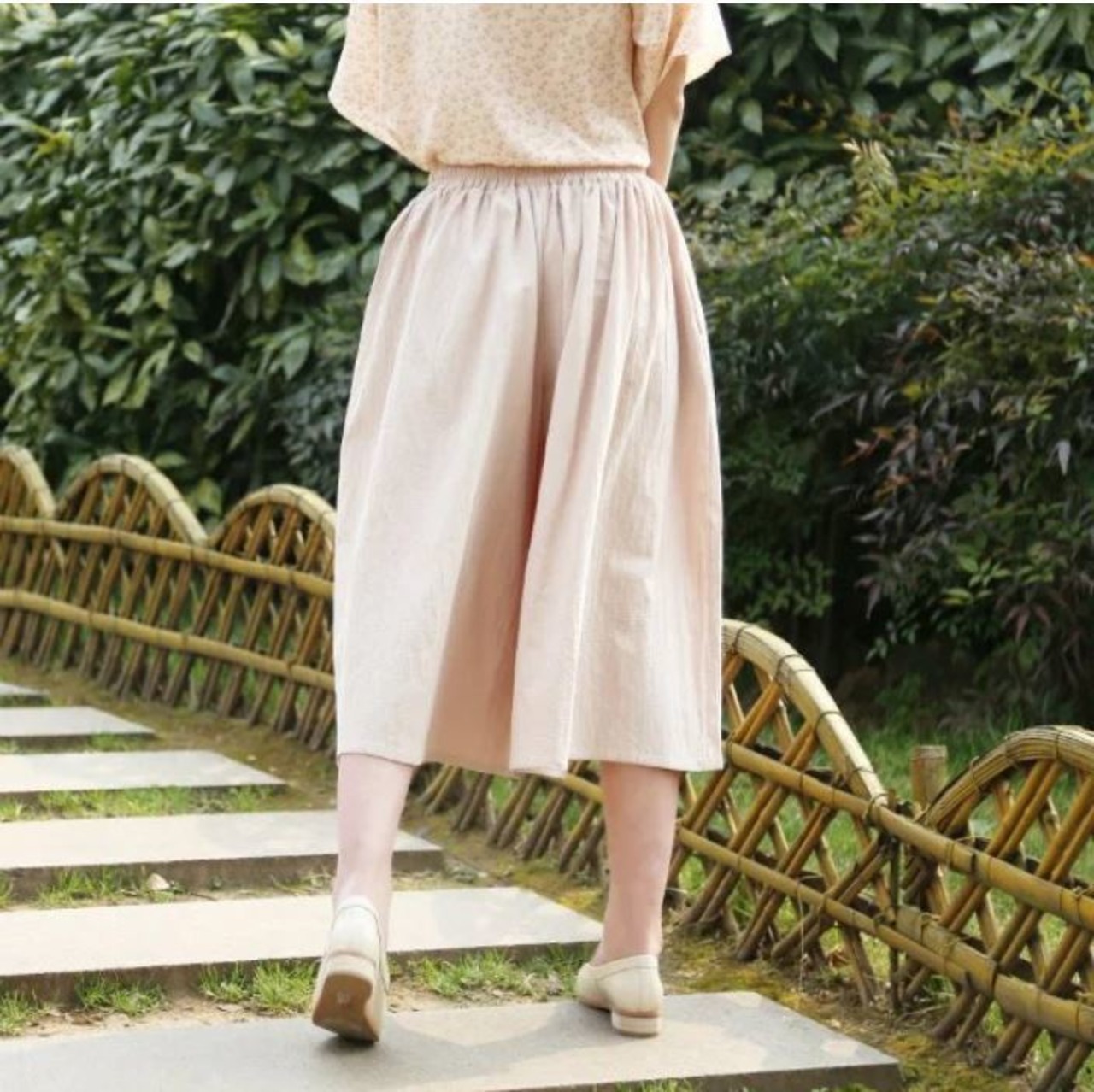 レディース 綿とリネンのウエストゴムの無地 ワイドパンツ 565