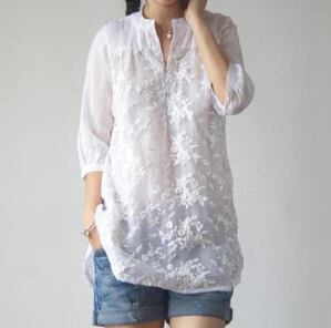 きれいめブラウス☆スリットネック 七分袖フラワーレースシャツ/無地 Vネック きれいめ 上品 エレガントレディースファッション トレンド 2018年夏秋 お出かけ デート 着まわし 1006