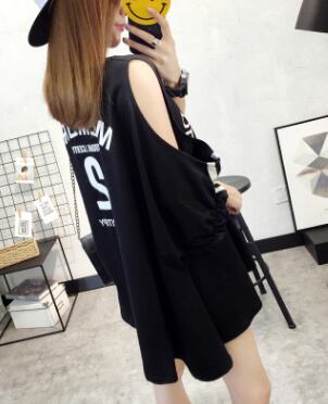 カジュアルプリント☆肩出しラウンドネックゆるふわシャツ/肌見せ 五分袖 ゆったり らくちん オーバーサイズ ゆるシルエット トップス カジュアル 大人かわいい おしゃれ お出かけ 着まわし 1018