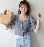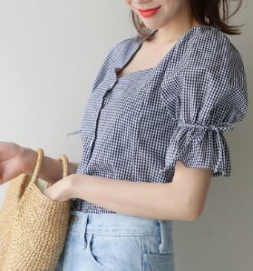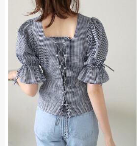 チェック☆ボートネックブラウス/くしゅ パフスリーブ バックレースアップシャツ ブラウス ボタン付き チェック 半袖 ガーリー 大人かわいい リボン 肌見せ レディースファッション トレンド 夏 お出かけ デート 1050