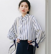 袖口が可愛い☆リボン付きフリルスリーブシャツ/ストライプシフォンシャツ ブルーストライプ 襟付き 長袖 リボン きれいめ エレガント 上品 大人かわいい レディースファッション トレンド 秋 デート お出かけ 女子会 1060
