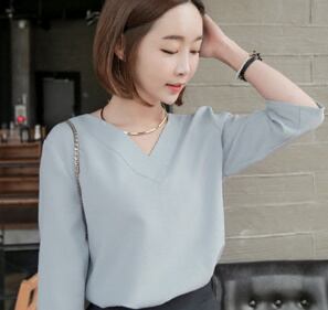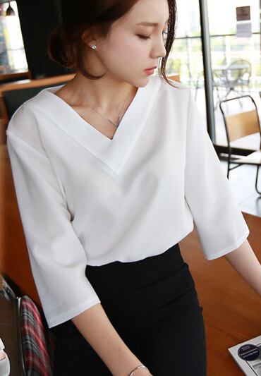 清楚系☆Vネック七分袖シャツ/無地 エレガント 上品 爽やか 大人かわいい ブラウス レディースファッション トレンド 秋 オフィスコーデ 通勤コーデ 着まわし 1065