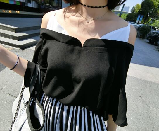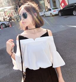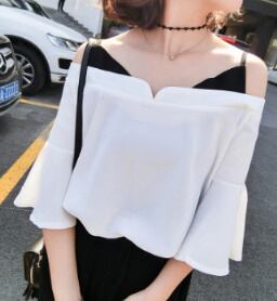 キャミ風ショルダー付き☆オフショルトップス/フレア袖 無地 キャミソール ホワイト ブラック ブラウス きれいめ エレガント 上品 レディースファッション トレンド 夏 お出かけ 女子会 1066