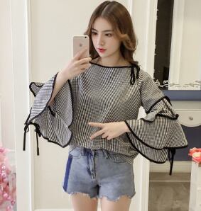 エレガント☆トリプルフレア袖のブラウス/長袖 チェック ギンガムチェック スクエアネック ガーリー 大人かわいい エレガント 上品 キュート フリル ブラウス トップス リボン付き レディースファッション トレンド 秋 お出かけ デート 女子会 1067