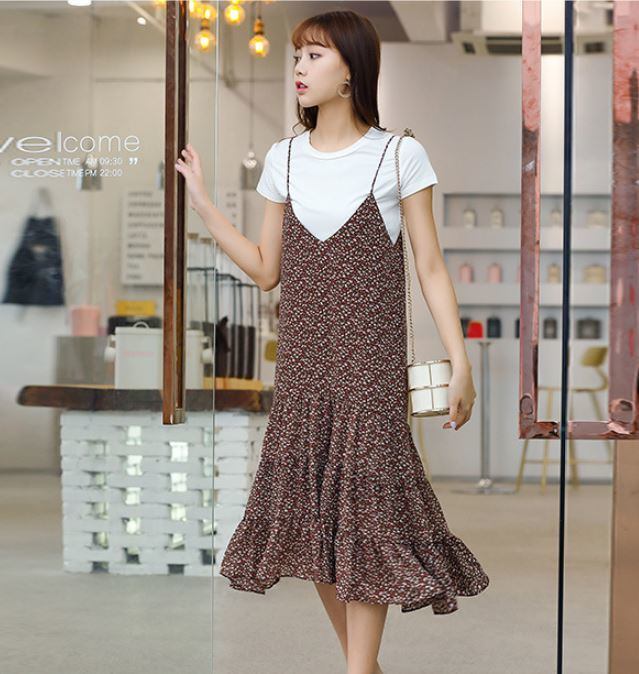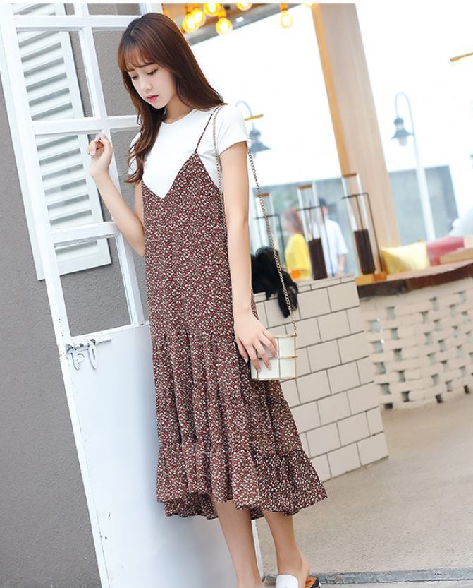 フラワーオフショルダー シフォン ロングスカート ストラップレス サスペンダースカート/オールインワン レイヤード ミモレ丈 フリル ガーリー カジュアル レディースファッション トレンド 夏秋 お出かけ 着まわし 571