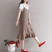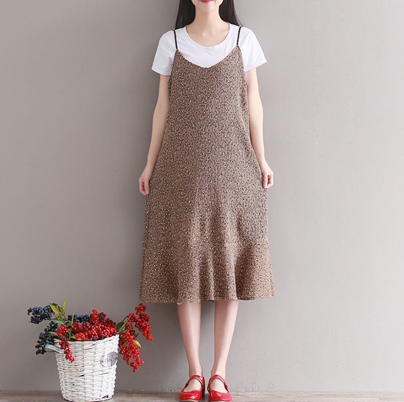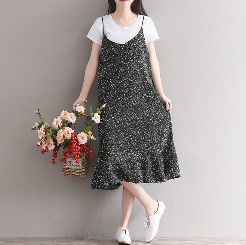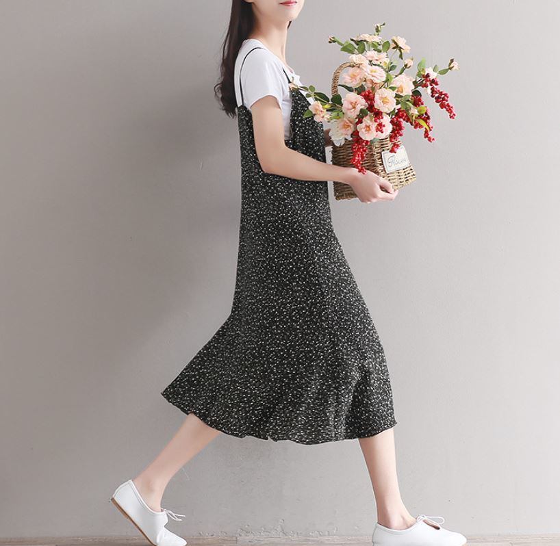 アートフィッシュテイルプリントノースリーブスリング 花柄シフォンスカート/レイヤード スカジャン ミモレ丈 カジュアル レトロ レディースファッション トレンド 夏秋 お出かけ 572