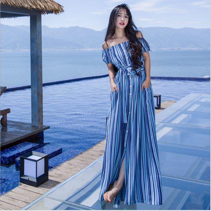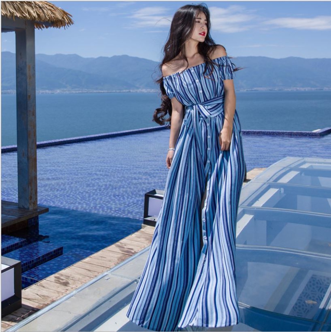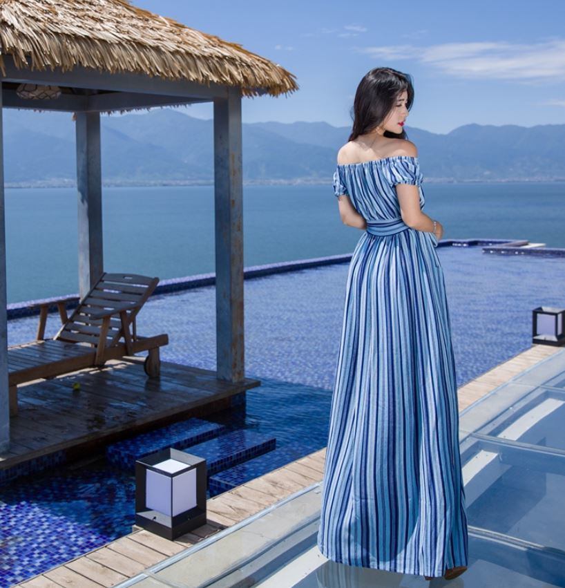 ブルーストライプのオフショルダーロング丈ワンピース エレガント 海外セレブ 上品 きれいめ お呼ばれ リゾート 583