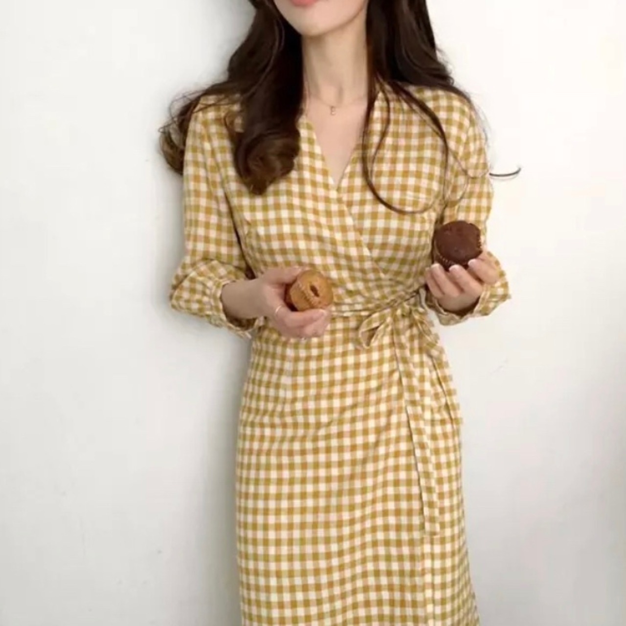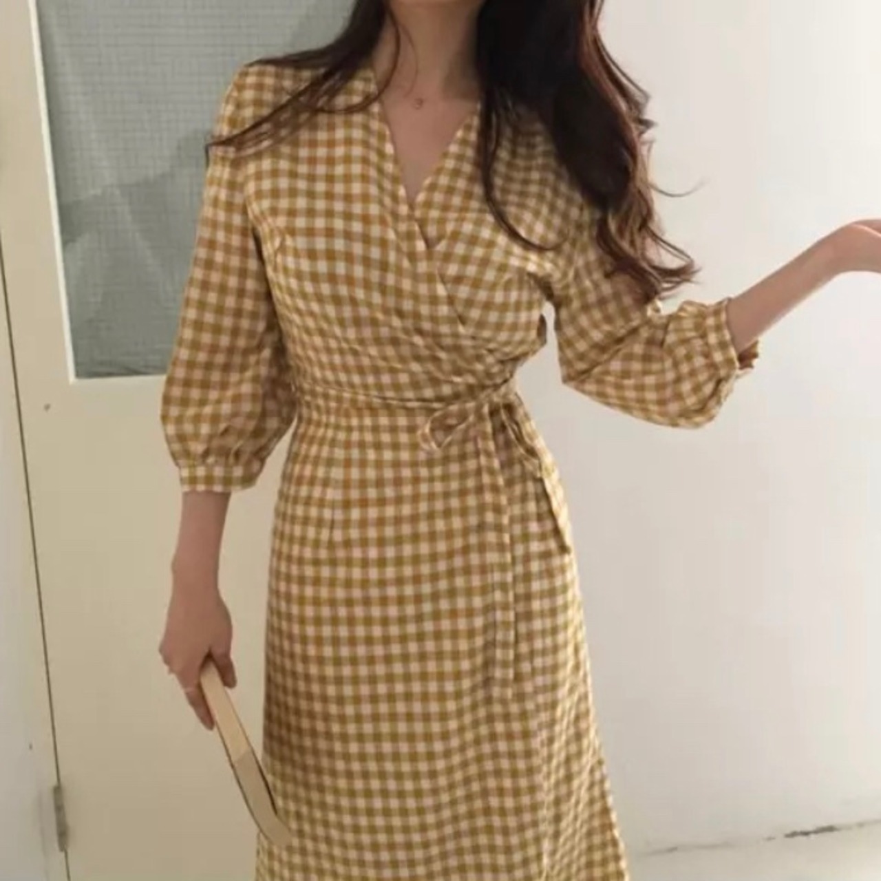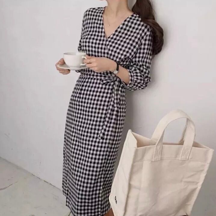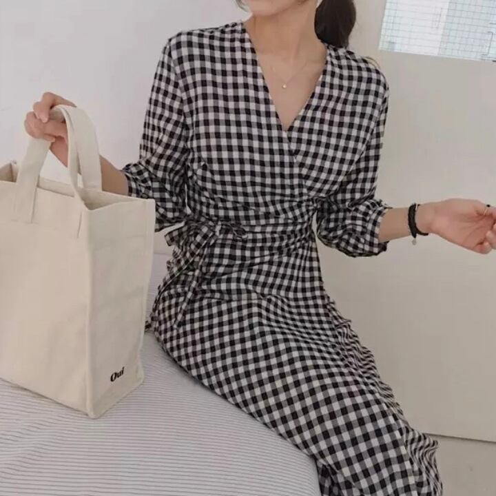 ギンガムチェック 七分袖 タイトワンピース レトロ ガーリー デート 女子会 お出かけ トレンド 着回し【613】