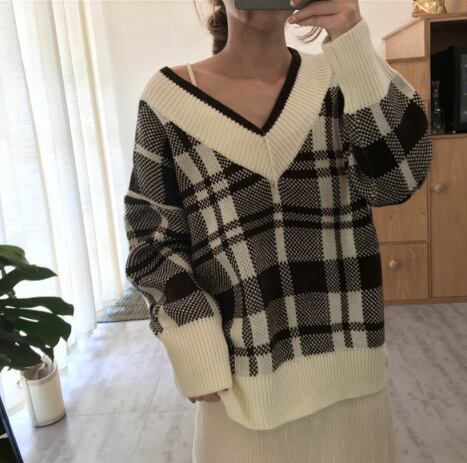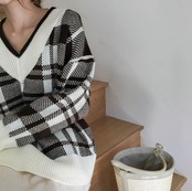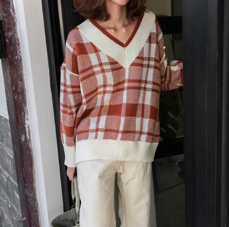 シック☆Vネックゆったりチェックセーター 大柄チェック 長袖 セーター カジュアル 上品 大人女子 レディースファッション トレンド 秋 お出かけ 着まわし【A132】