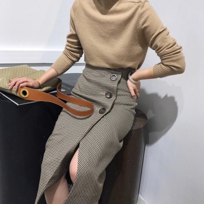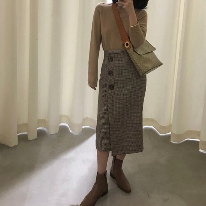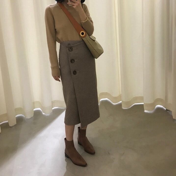 タイトスカート ミモレ丈 チェックレトロ 上品 ビッグボタン レディースファッション 秋 トレンド お出かけ 女子会 デート【628】