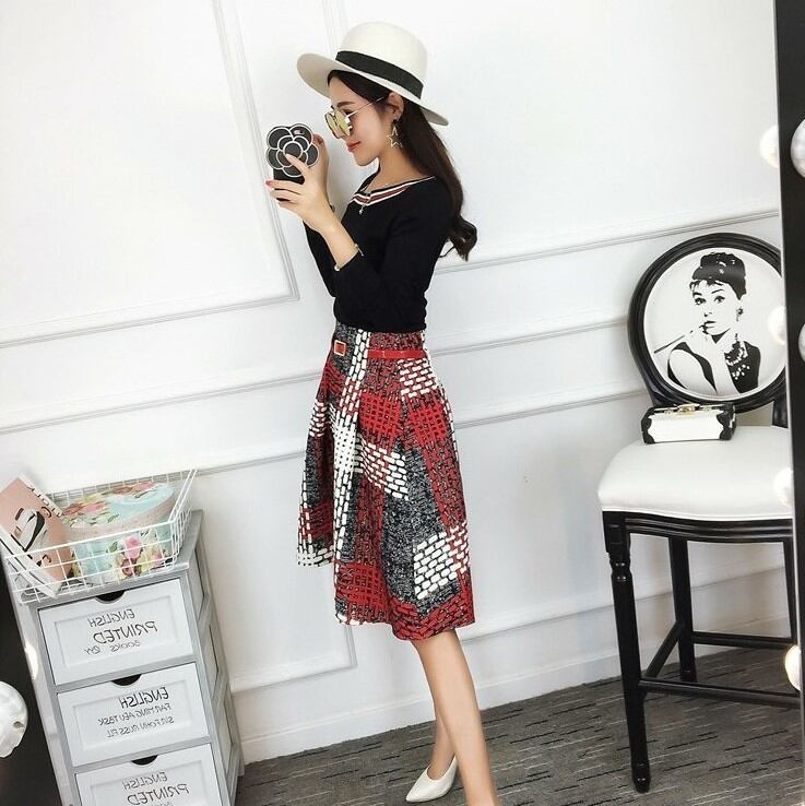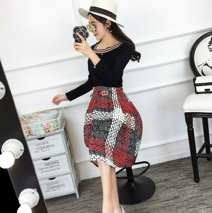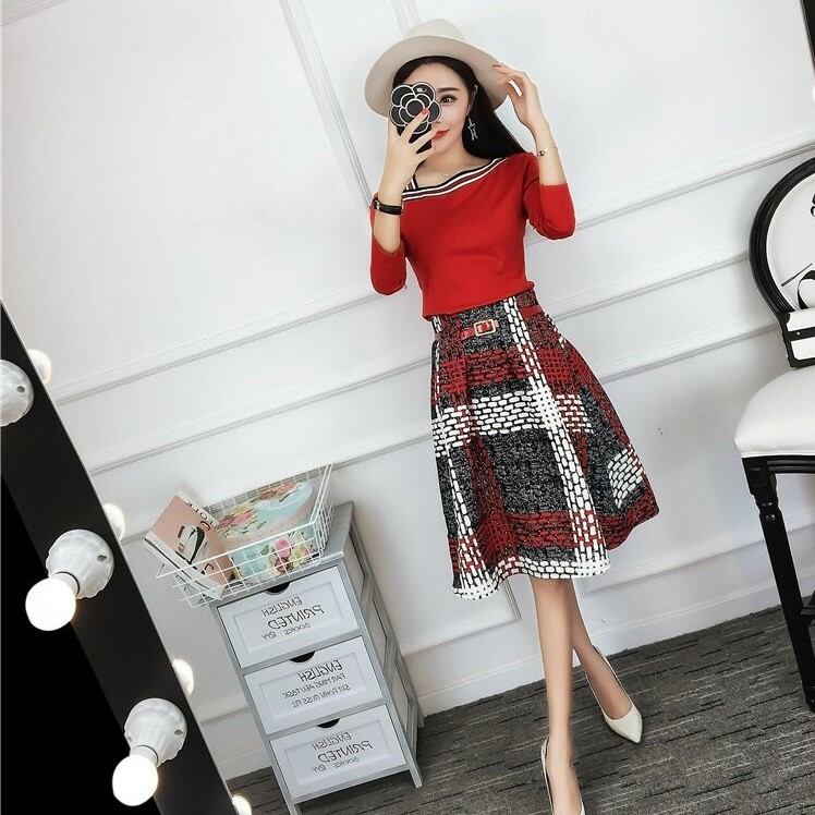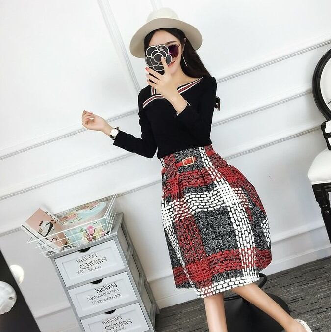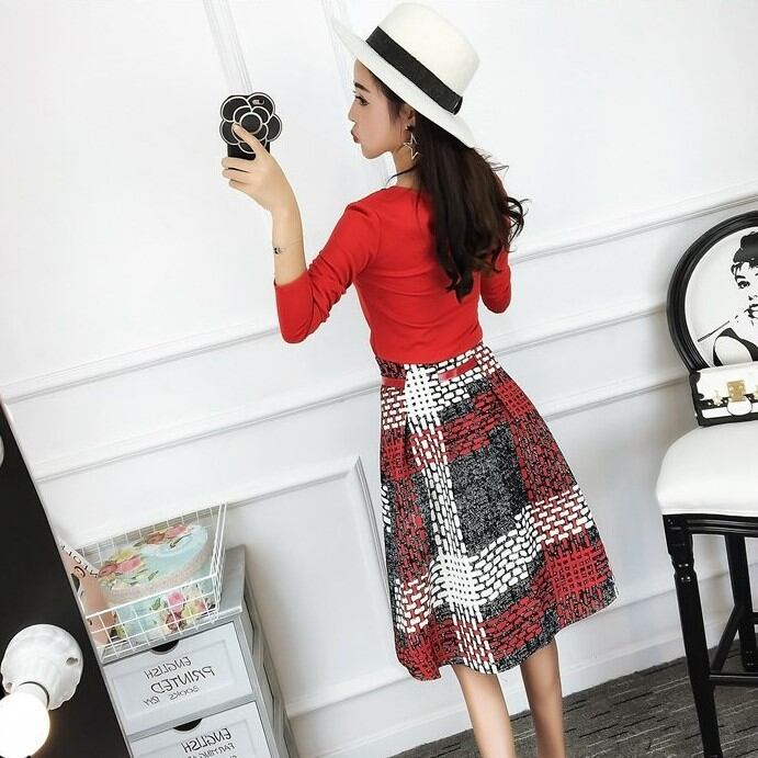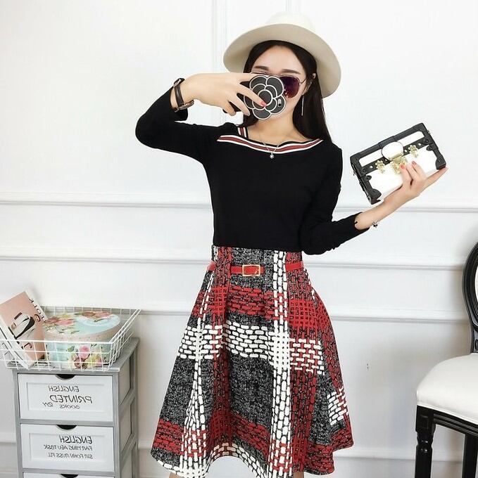 襟元のラインがおしゃれな長袖トップス&ハイウエストチェックスカートのセットアップ 【800】