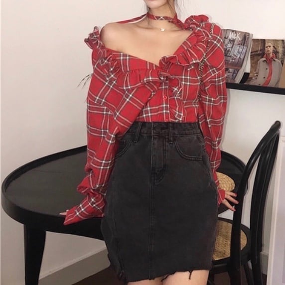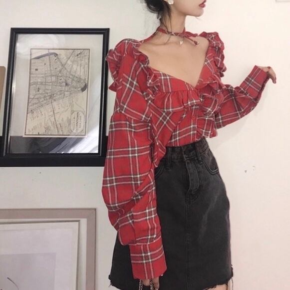 ガーリー セクシー☆深Vネックドロップショルダー フリルチェックシャツ フリル チェック柄 シャツ ブラウス Vネック セクシー 襟付き 襟 大柄チェック タータンチェック カラーチェック 華やかチェック レッド 大人かわいい カジュアル 長袖 レディースファッション トレンド 秋 お出かけ デート 女子会【676】