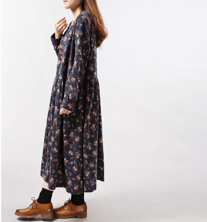 レトロふんわり☆ゆったりワンピース 長袖 花柄 レトロフラワー コットン リネン ブルー レッド イエロー 大人かわいい レディースアパレル トレンド 楽ちん カジュアル ラウンドネック ミモレ丈 全3色 秋 デート お出かけ 女子会 790