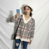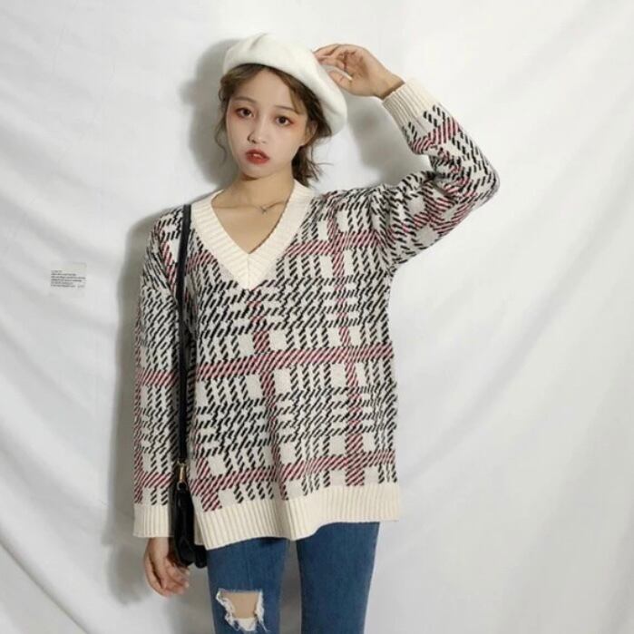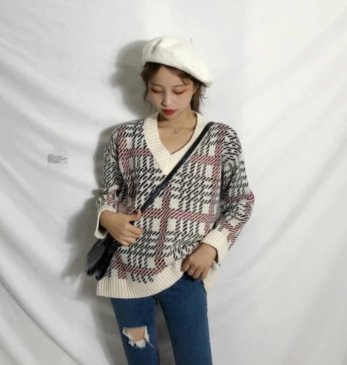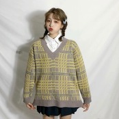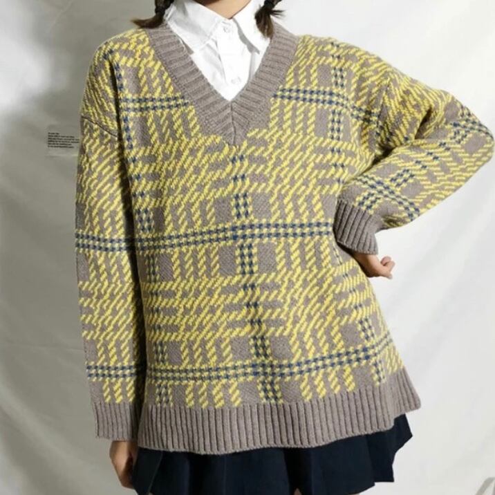 シンプル☆Vネックチェックトップス 華やかチェック チェック 大柄チェック きれいめチェック 長袖 ホワイト イエロー Vネック ニット カジュアル シンプル 大人かわいい 千鳥チェック おしゃれ ニットトップス レディースファッション トレンド 秋 全2色 デート 女子会 着まわし【698】