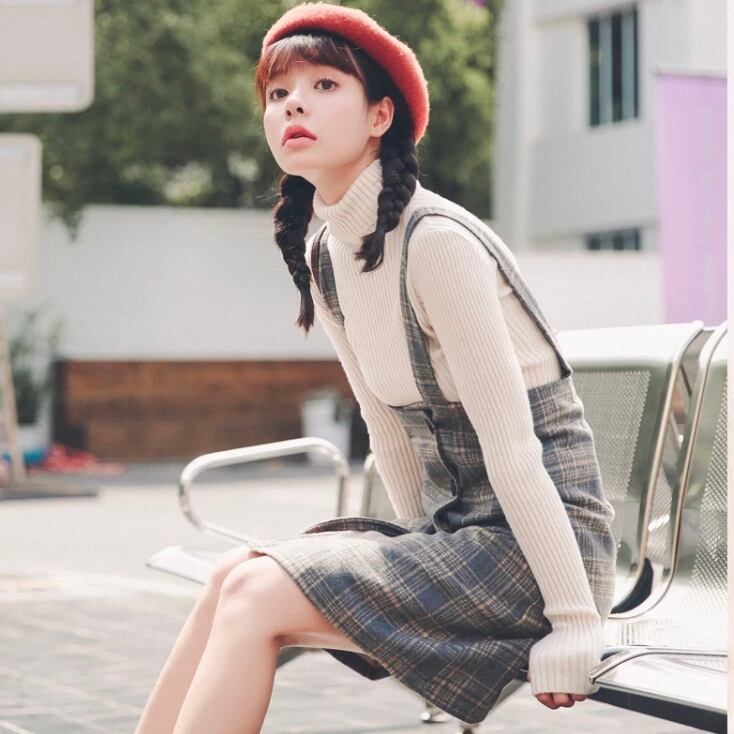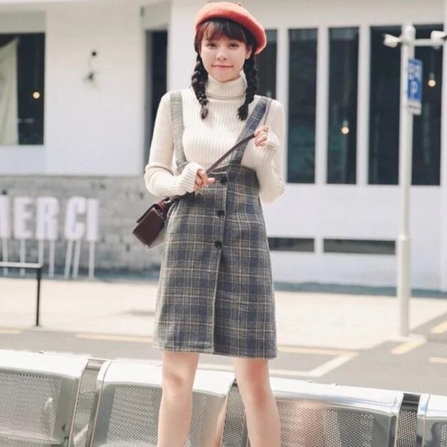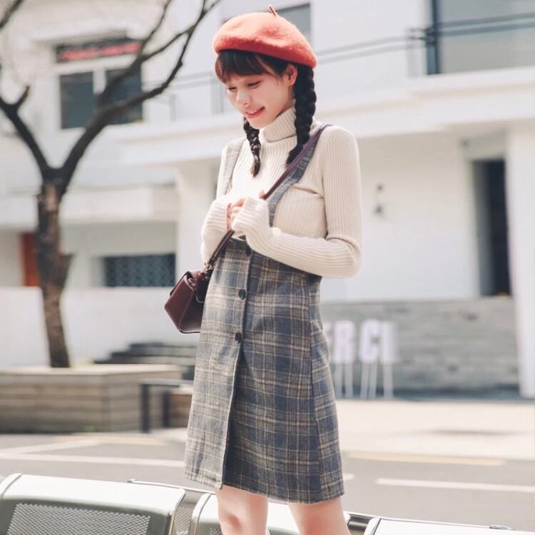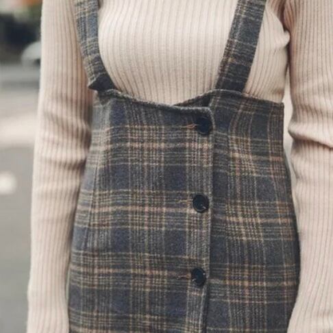 ミニ丈 ガーリーチェックフロントボタン サロペットスカート E43
