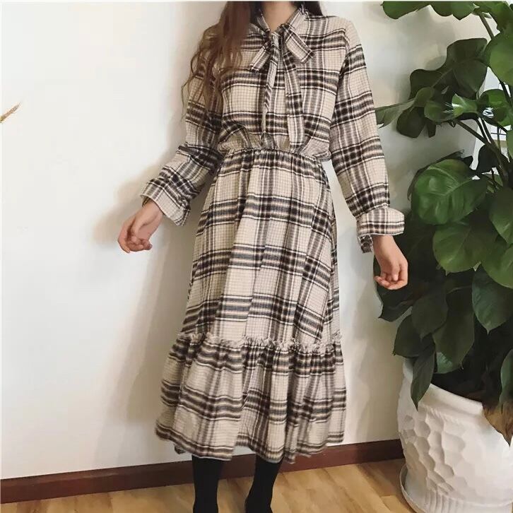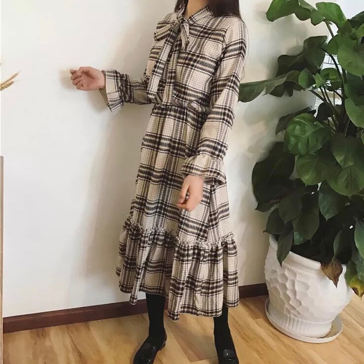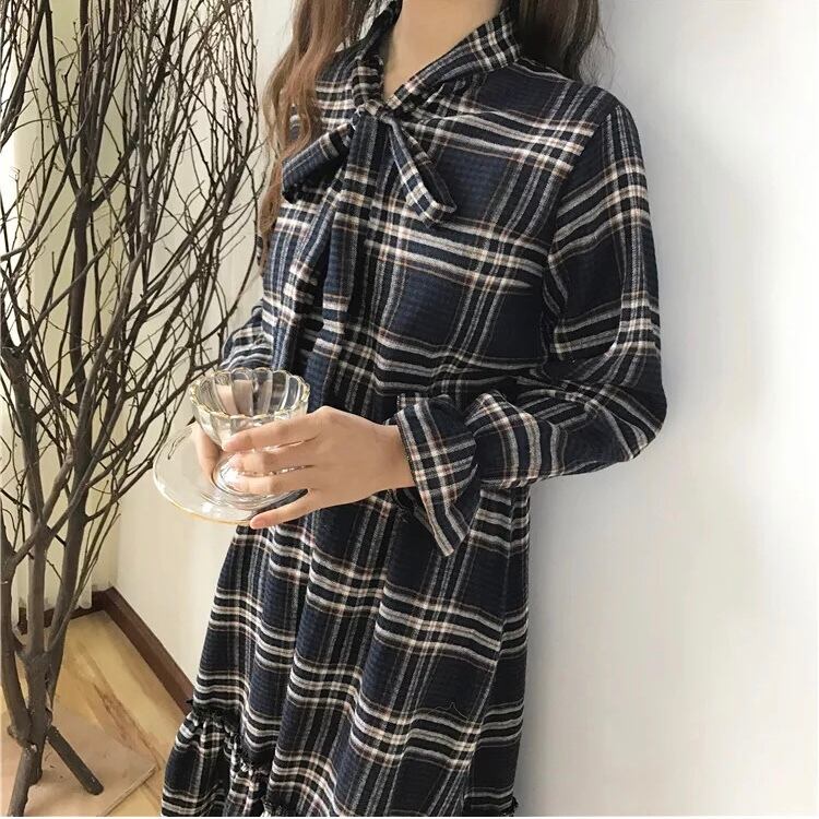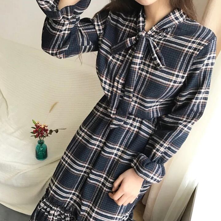 ボウタイ 長袖フリル チェック 2カラーワンピース デート 女子会 通勤コーデ E45
