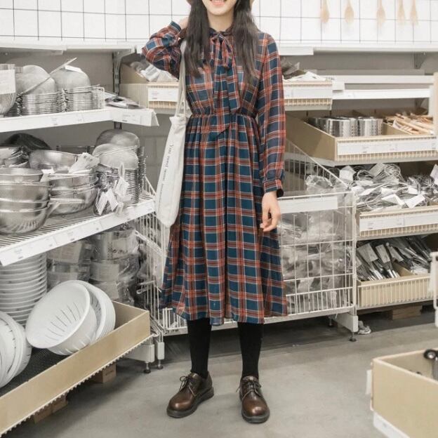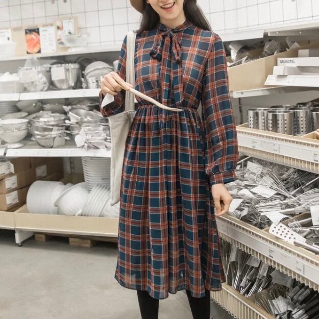 ワンピース リボン カジュアルガーリー 長袖ワンピース ミモレ丈 おでかけ 着回しE47
