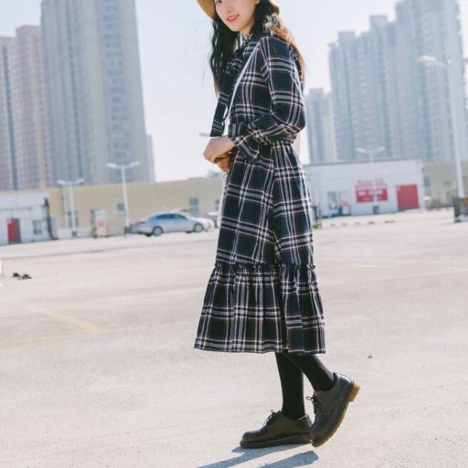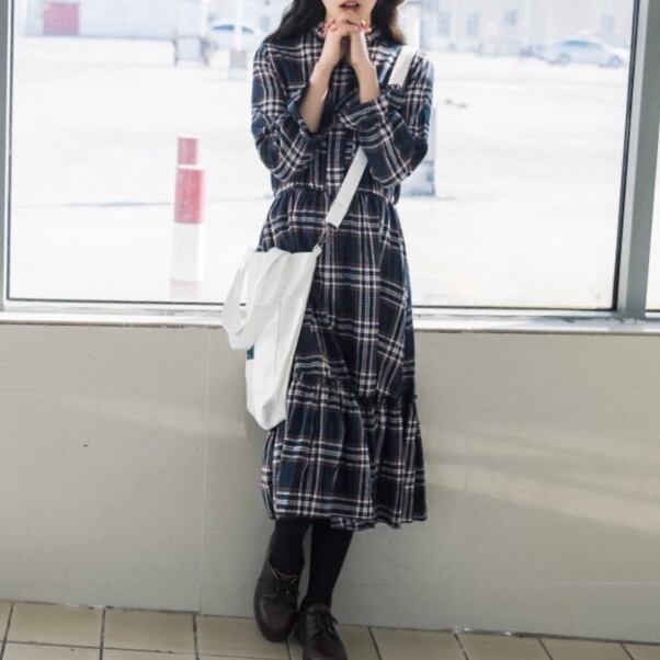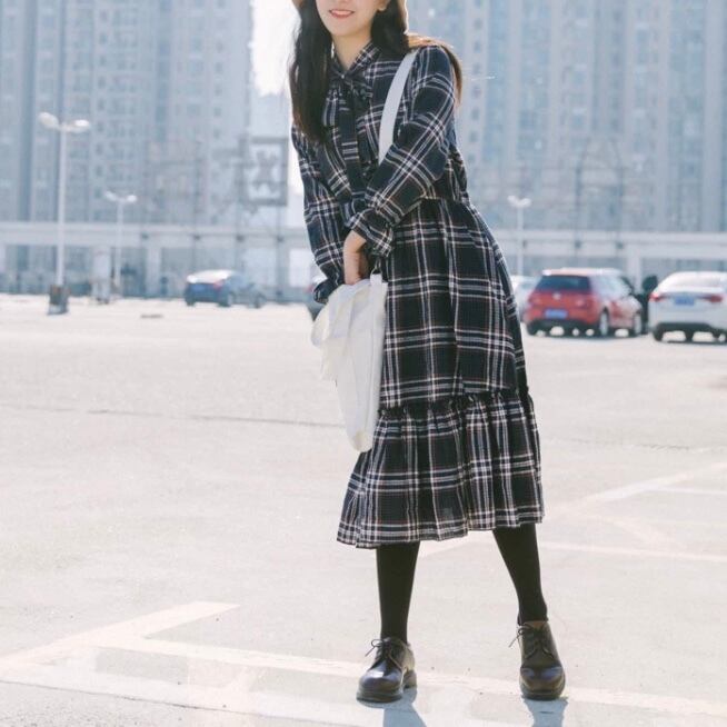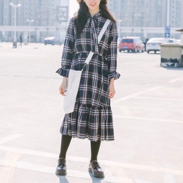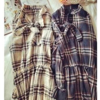 ボウタイリボン フレアチェックワンピース デート 女子会 お出かけE48