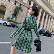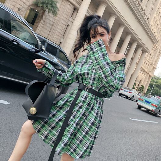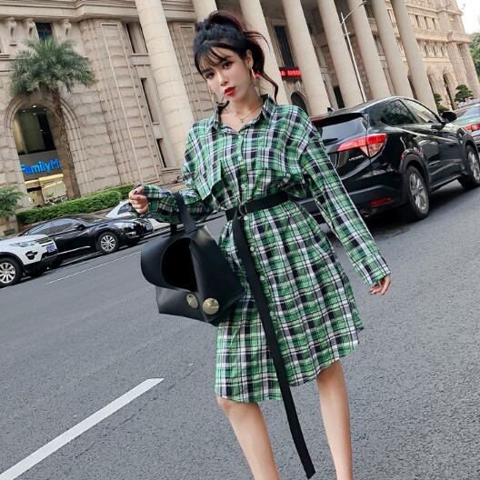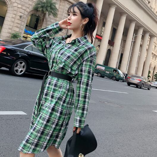 大柄チェックワンピース ミディアム丈 ドレスシャツ ベルト付き ガーリー カジュアル レディースファッション トレンド お出かけ デート 【A428】