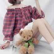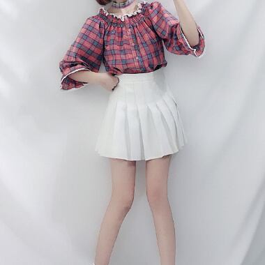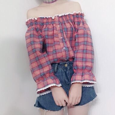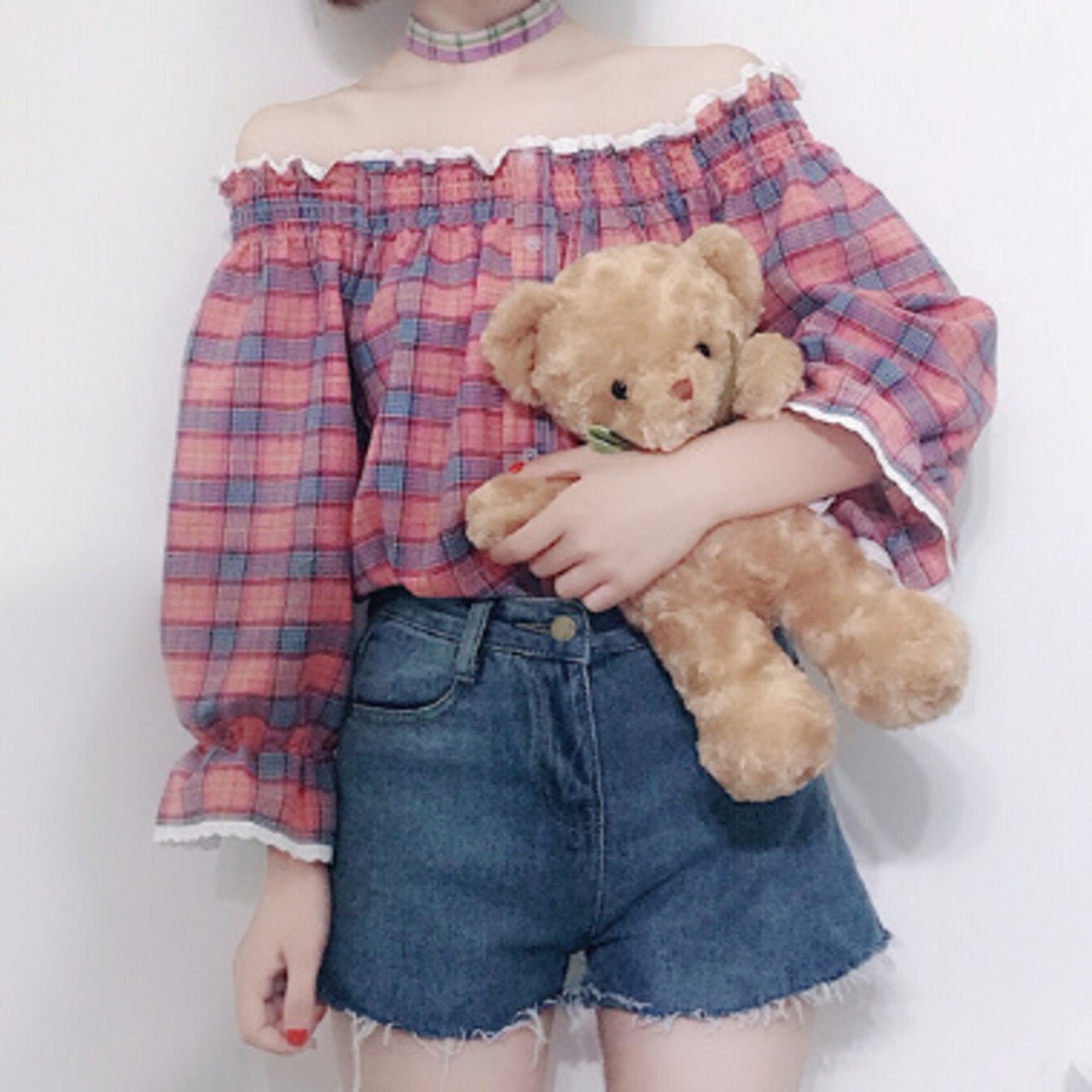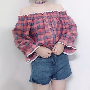 オフショル 大柄チェック トランペットパフ袖キュートシャツ ガーリー レディースファッション トレンド お出かけ デート【A449】
