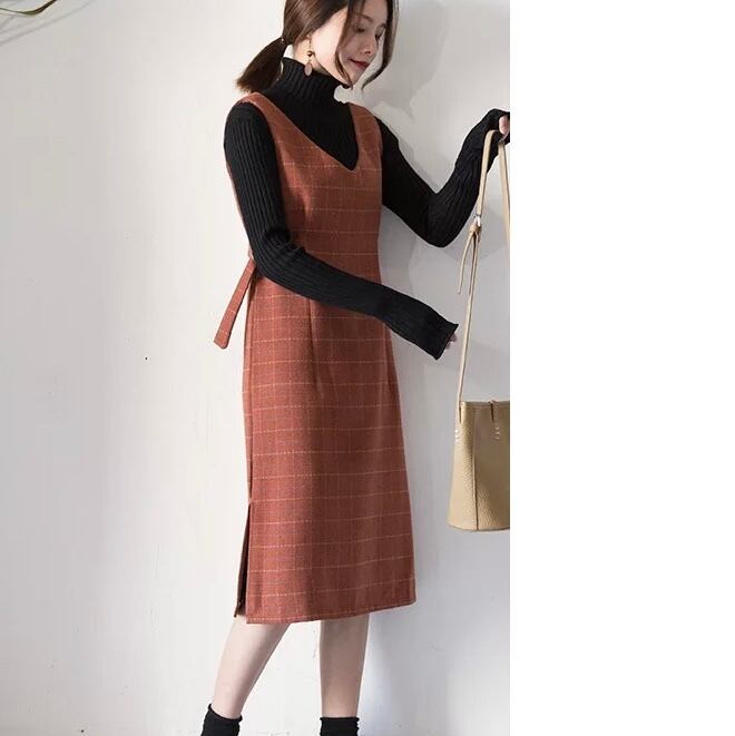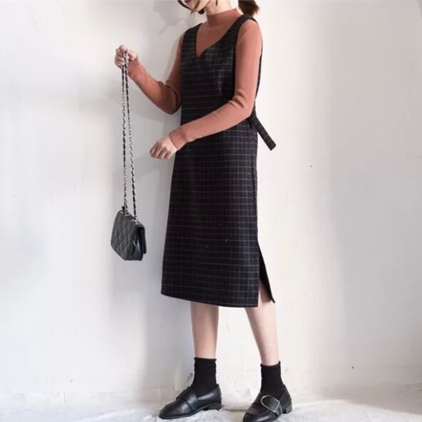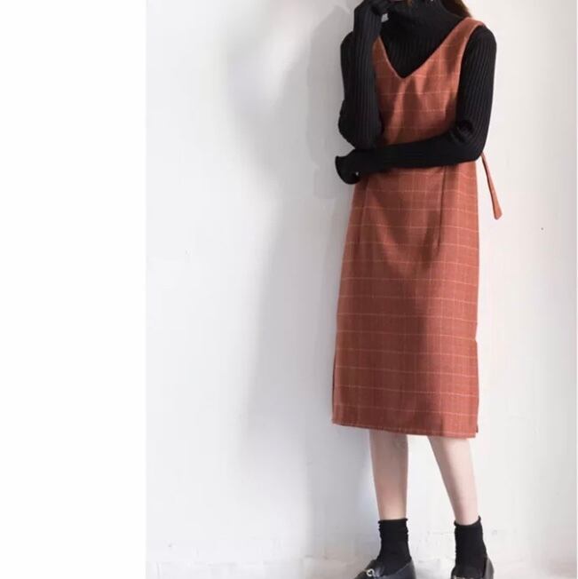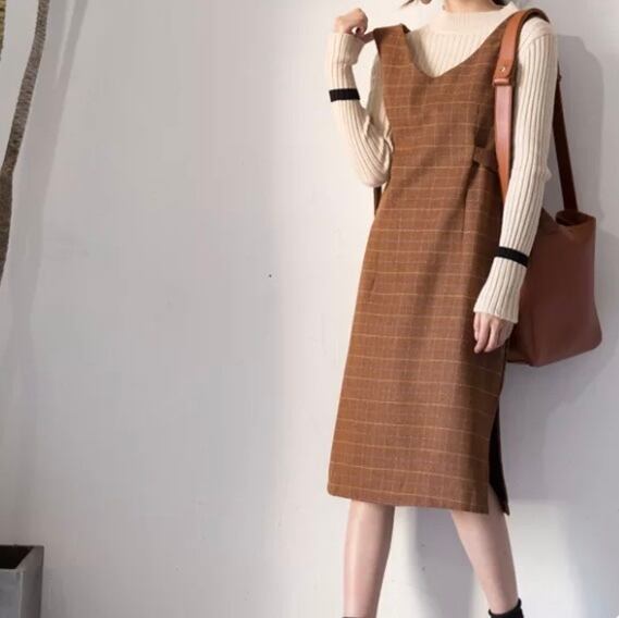 秋冬レトロ ウエストマーク ワンピース スリット デート カジュアル ガーリーE52