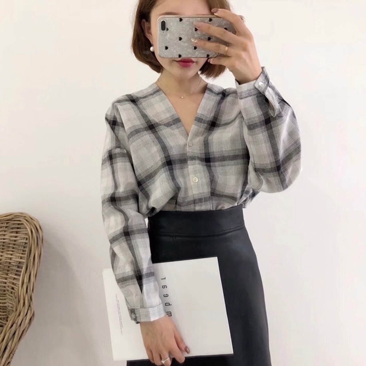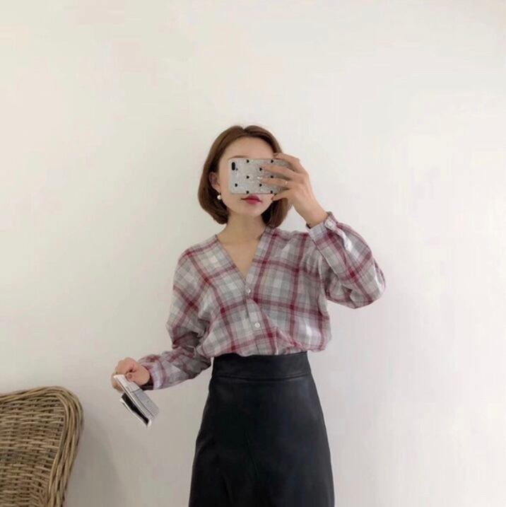 Vカット スカラップチェックシャツ デート カジュアル 着回し E60