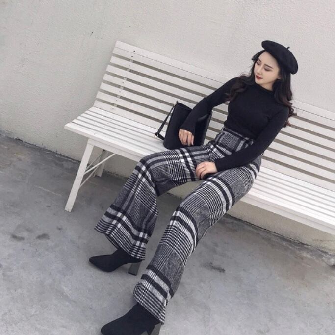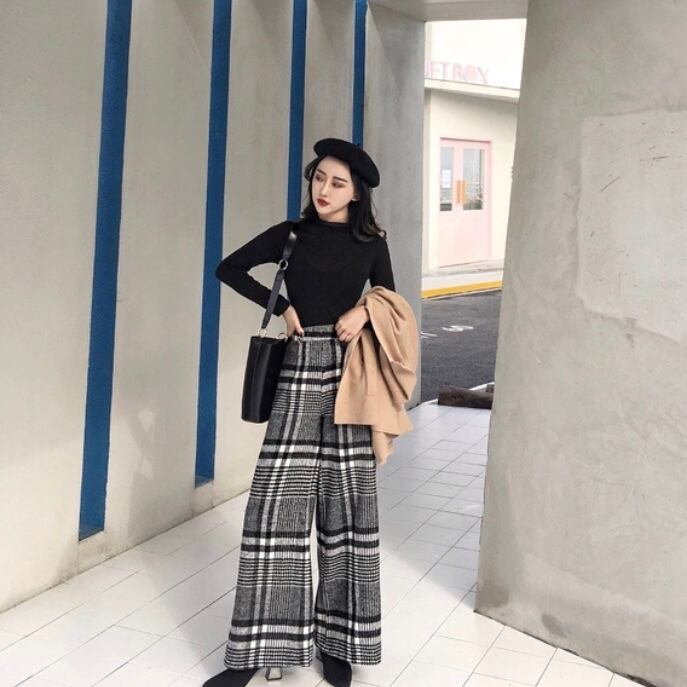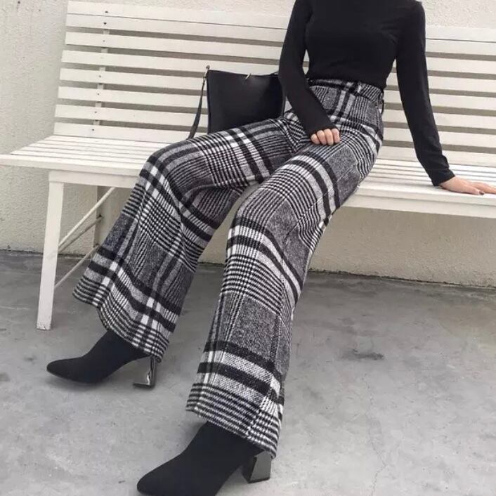 大柄チェック ワイドパンツ カジュアル レトロ おでかけ デート E73