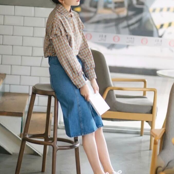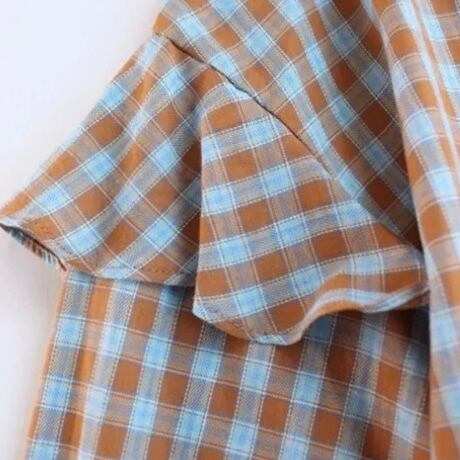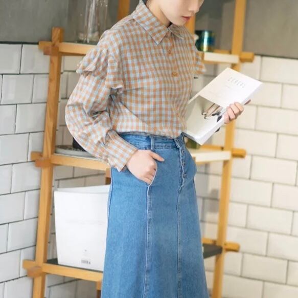 フリルショルダー チェックシャツ カジュアル ガーリー お出かけ 着回し E78