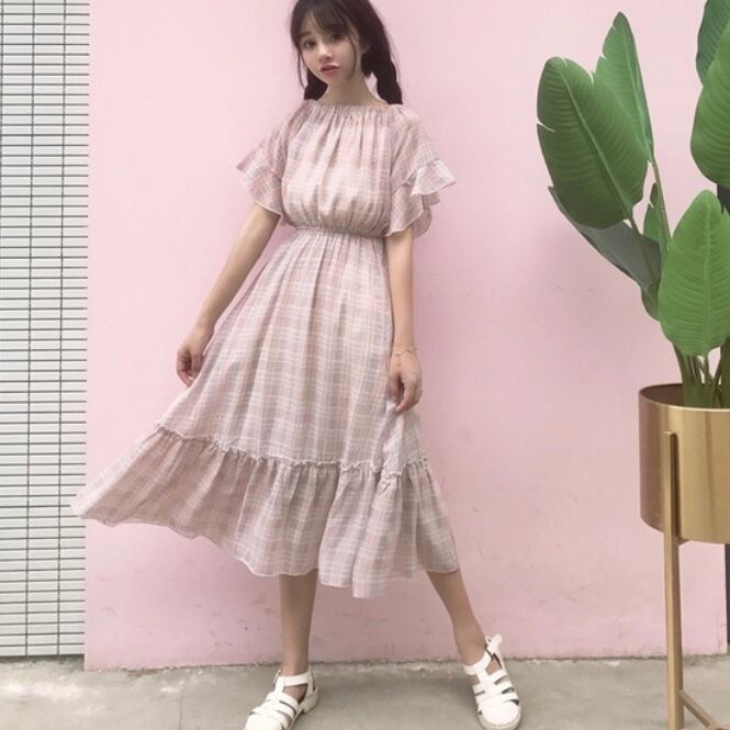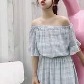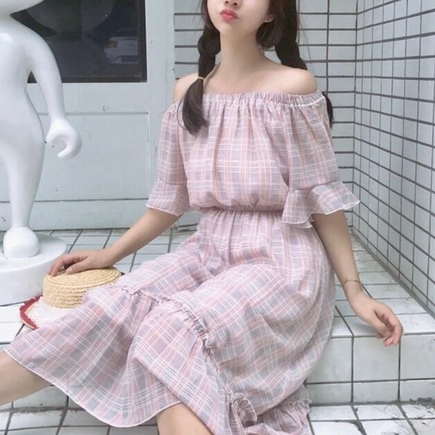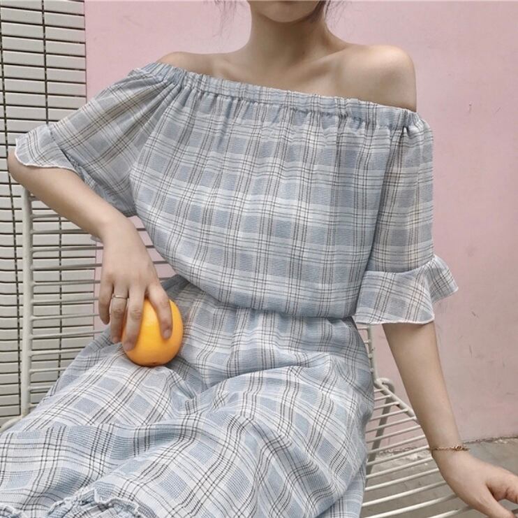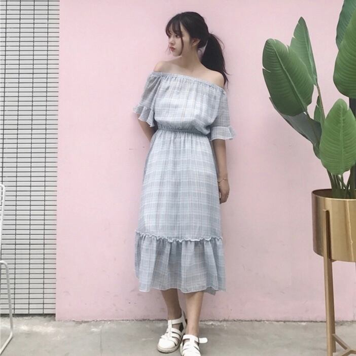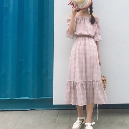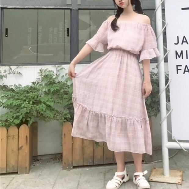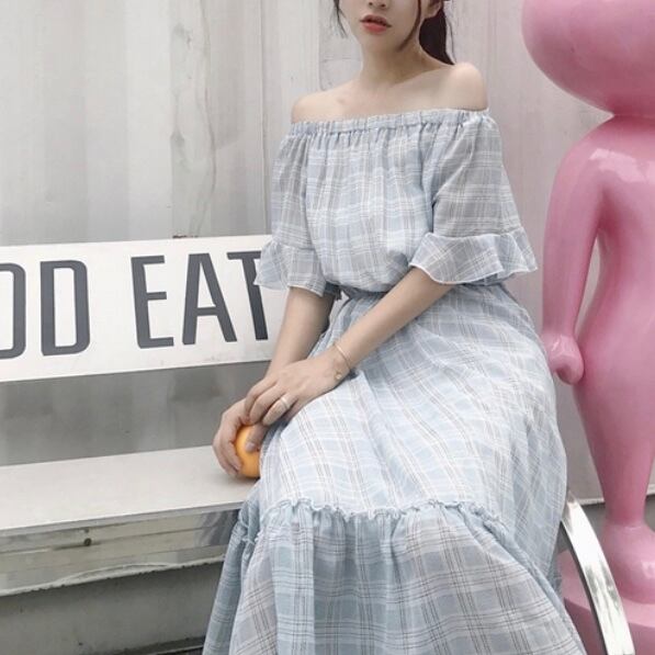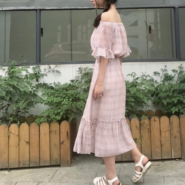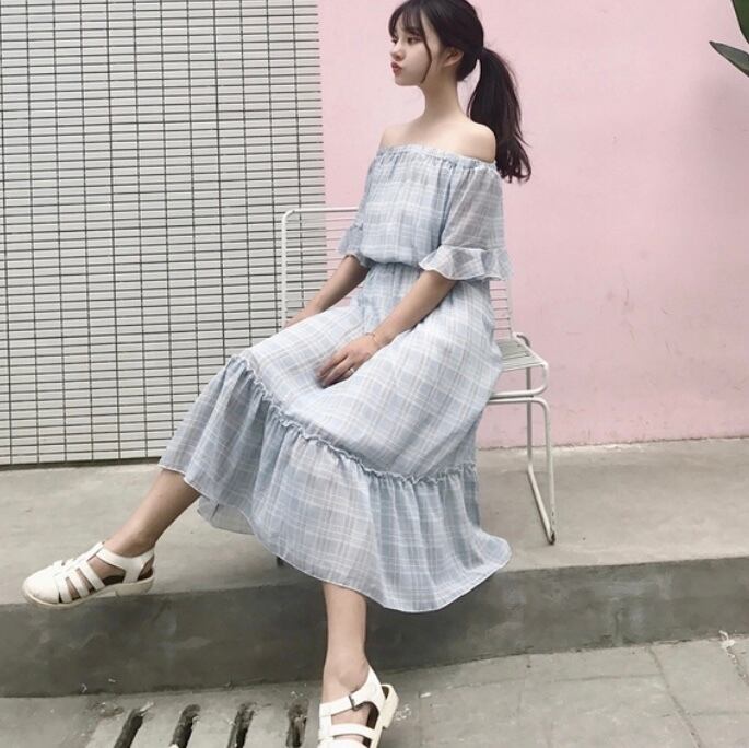 オフショルダーチェックワンピース 夏 レディース ロング デート ガーリー E98