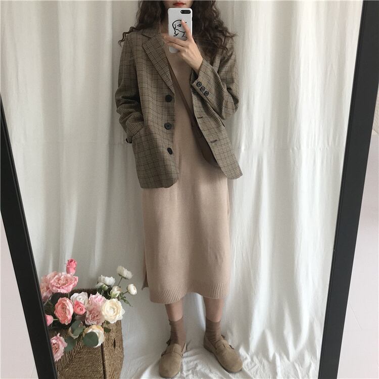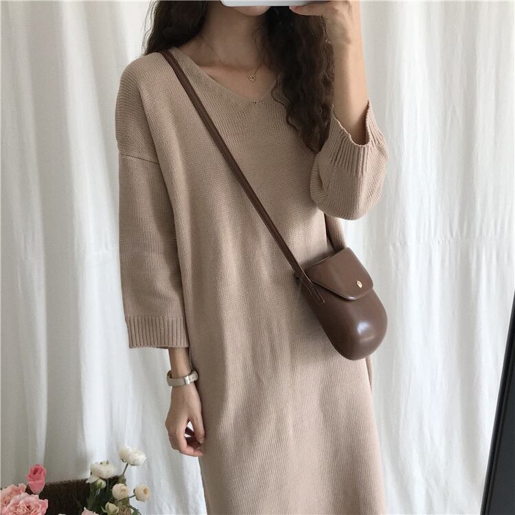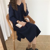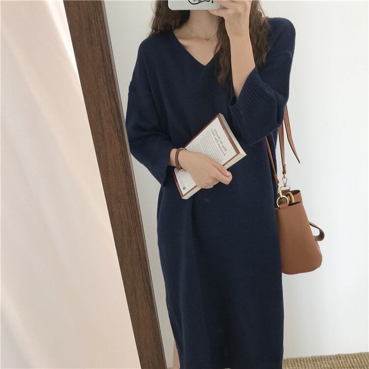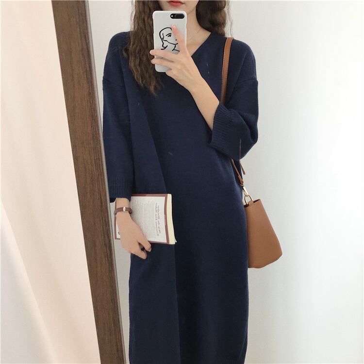 2018年秋新作 9分袖 シンプル使い勝手抜群のニットワンピース サイドスリット入り Vネック ニット ワンピース レディース ファッション 無地 おしゃれ ガールズ 大人上品 ゆったり 楽ちん デート 女子会 大人カジュアル お出かけ デート 体型カバー アプリコット ネイビー 【547】