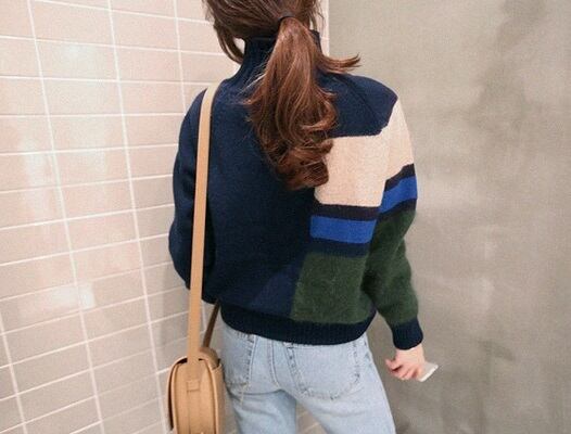 2018年秋冬新作 カラフルな配色が大人っぽい新感覚デザイン レディース ファッション タートルネック ハイネック セーター ニット カラーブロッキング 長袖 プチプラ ゆったり 楽ちん 大人カジュアル 通勤コーデ 女子会 デート お出かけ ミセス ダークグリーン グレー 【586】