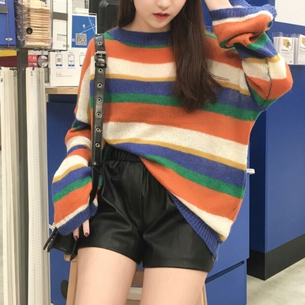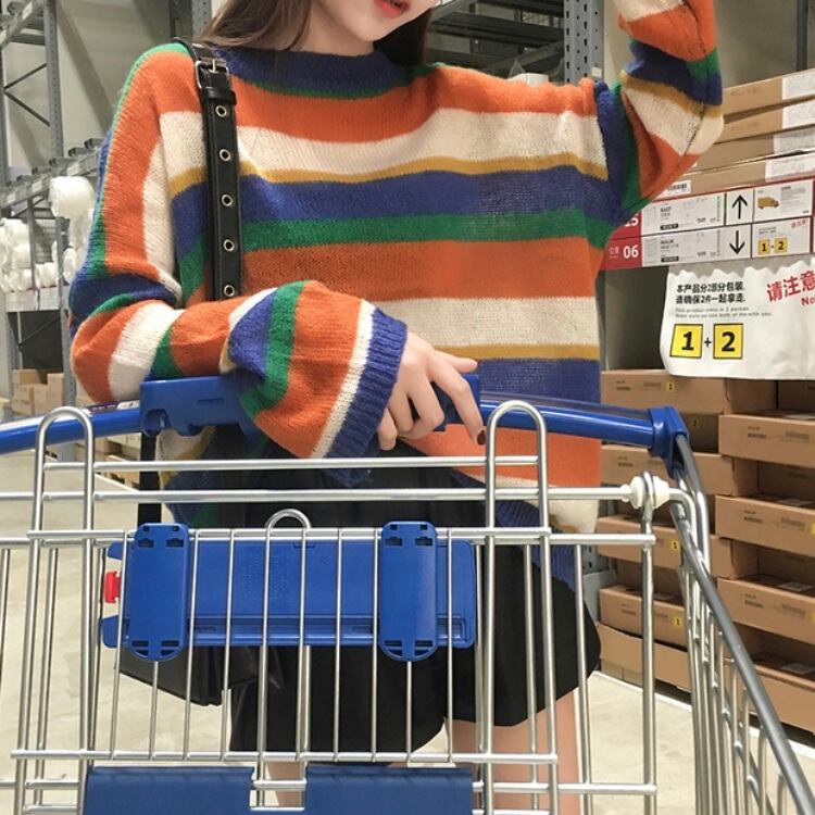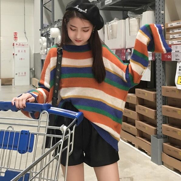 カラーニットトップス 秋冬 ゆる袖 ボーダー 長袖 カジュアル 着回し 女子会 F14