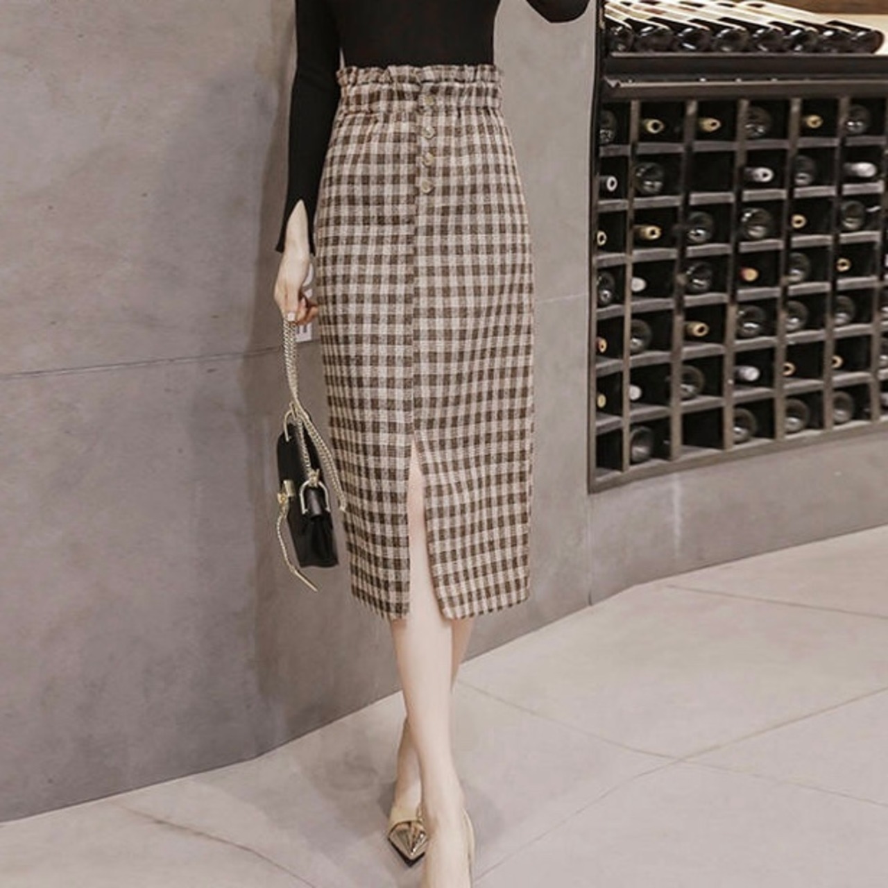ウエストマークスカート チェック フロントボタン ナチュラル スリット 韓国 オルチャン レディース 新作 細見え デート ママコーデ F25