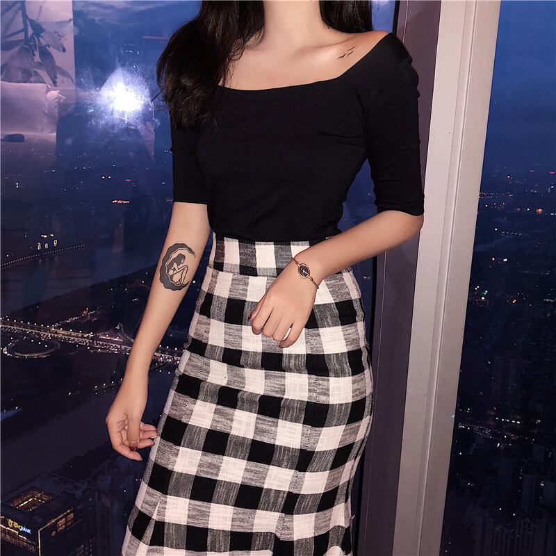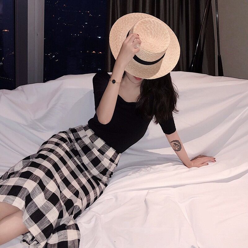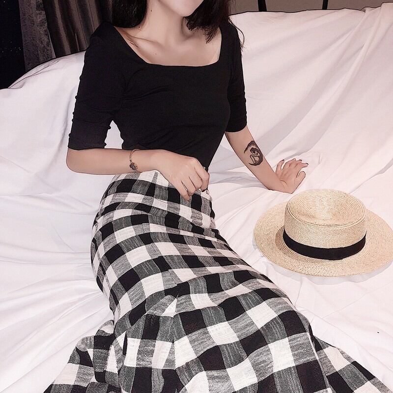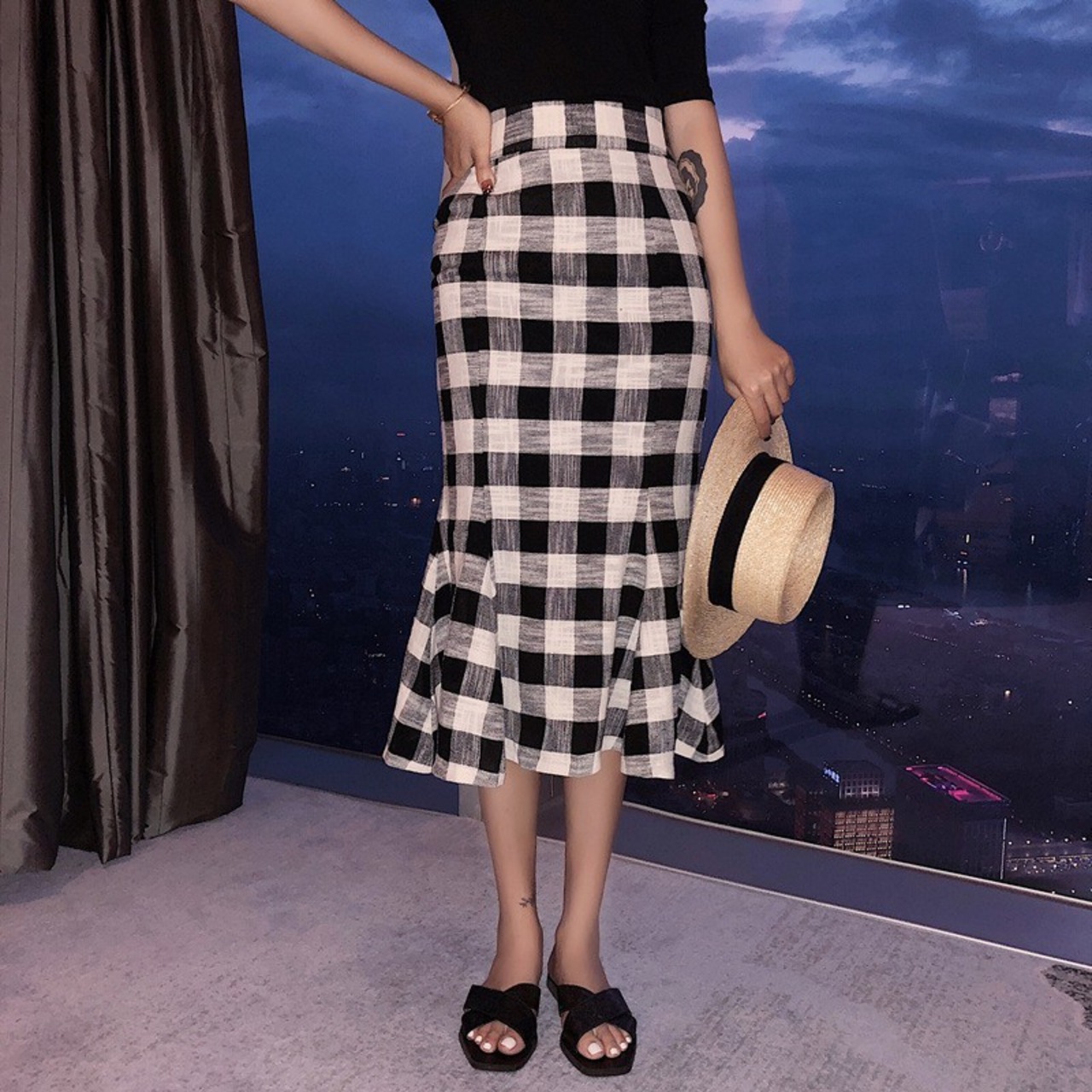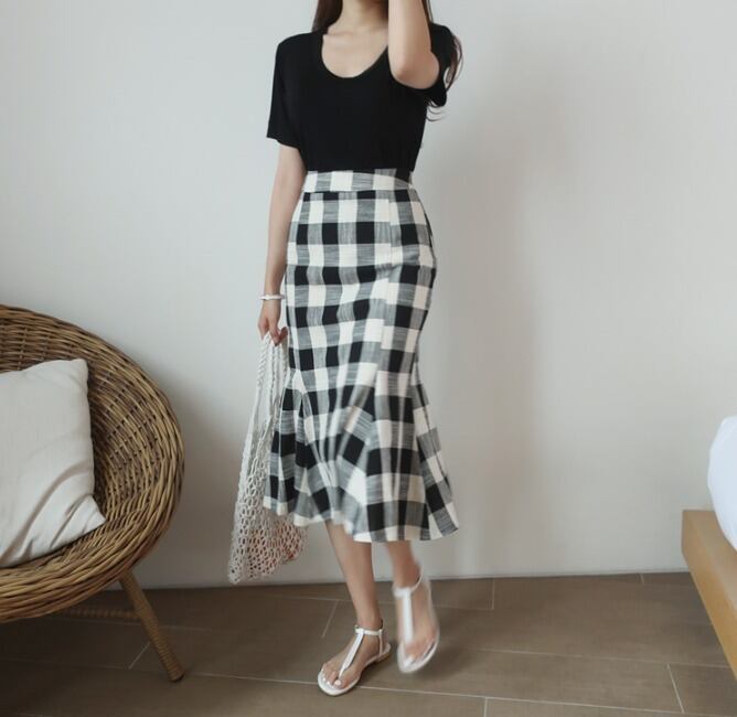 レディース オルチャン 韓国 リネン フリルスカート ボトムス チェックギンガムチェック ミモレ丈 【N108】