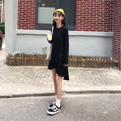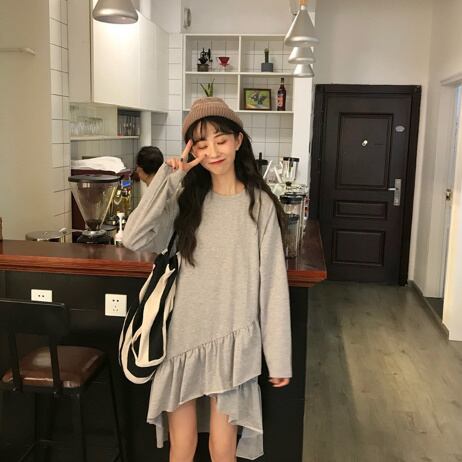 ワンピース セーター ラウンドネック 黒 ブラック グレー ロング ゆるニット オルチャン 韓国 着痩せ 大きいサイズ 秋冬新作 ファッション オーバーサイズ 体系カバー ミニ丈スカート アシンメトリフリル レディース 長袖 カジュアル ガーリー 大人かわいい ママコーデ お出かけ【J44】